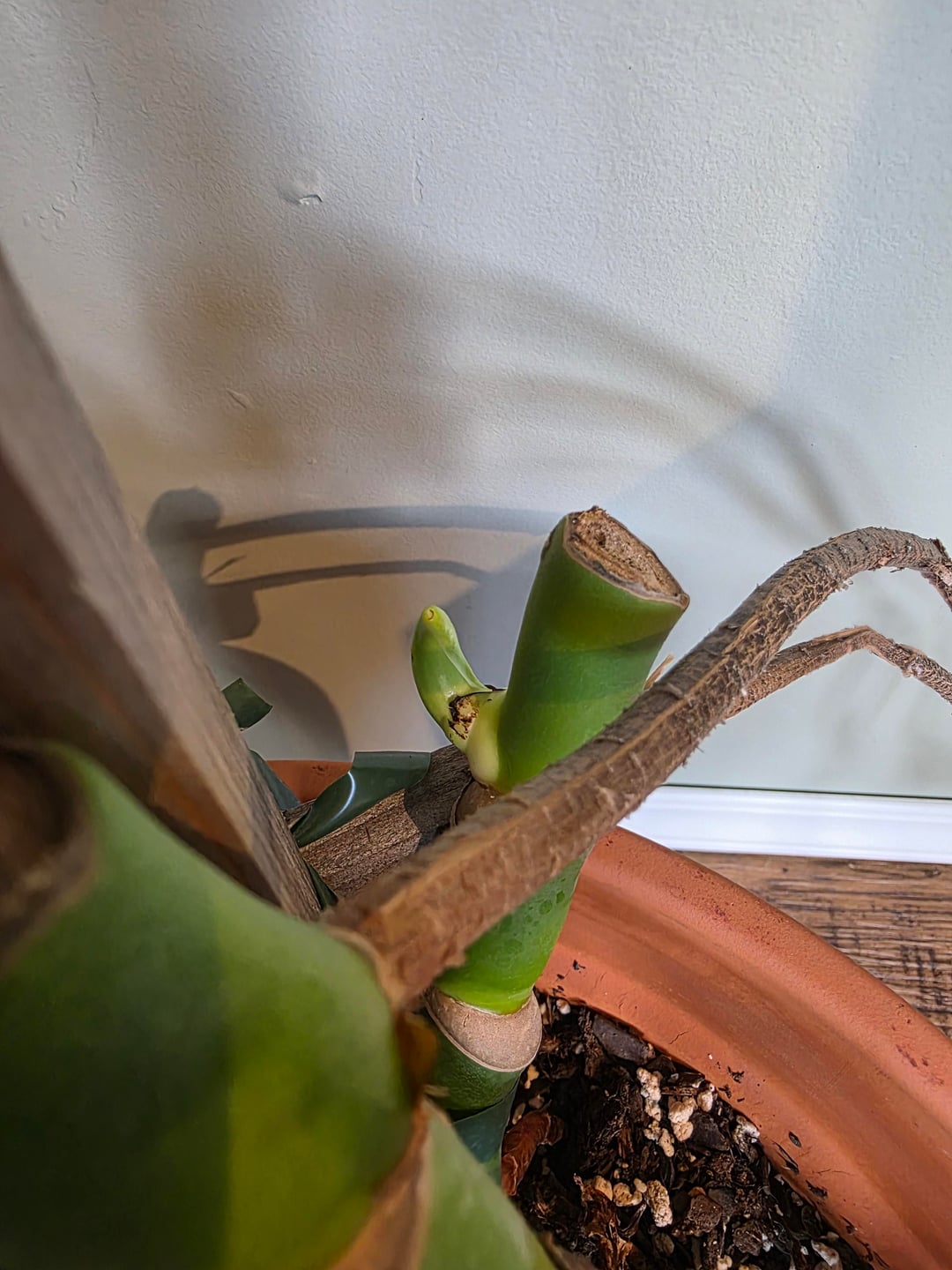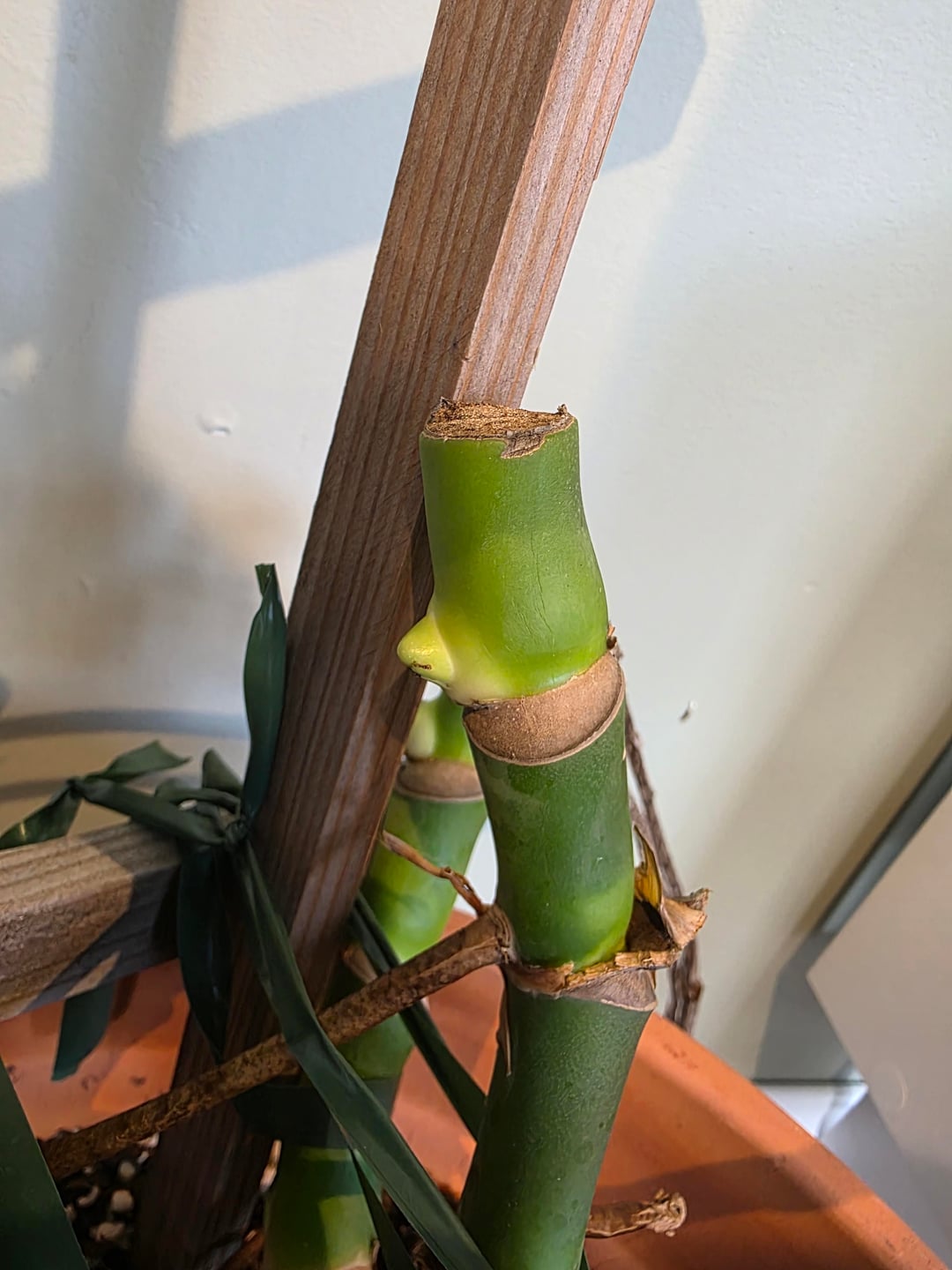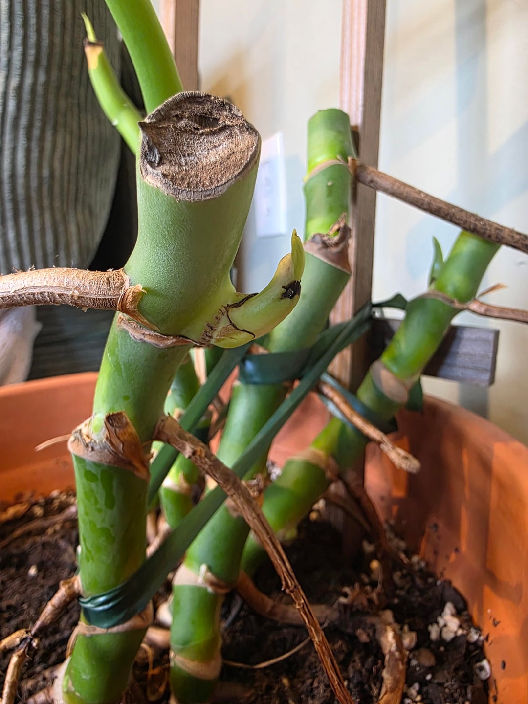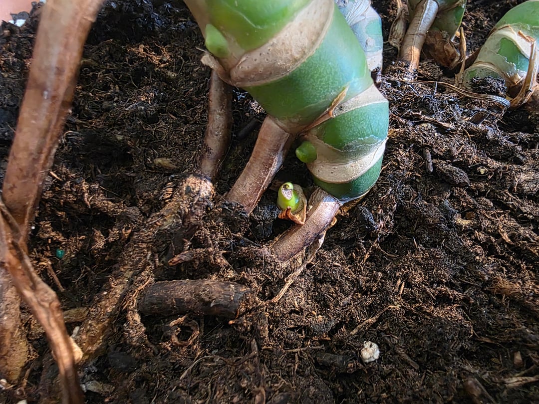 モンステラが凍ってしまったので、葉をすべてカットしてしまいましたが、今では新しい芽が出始めています。