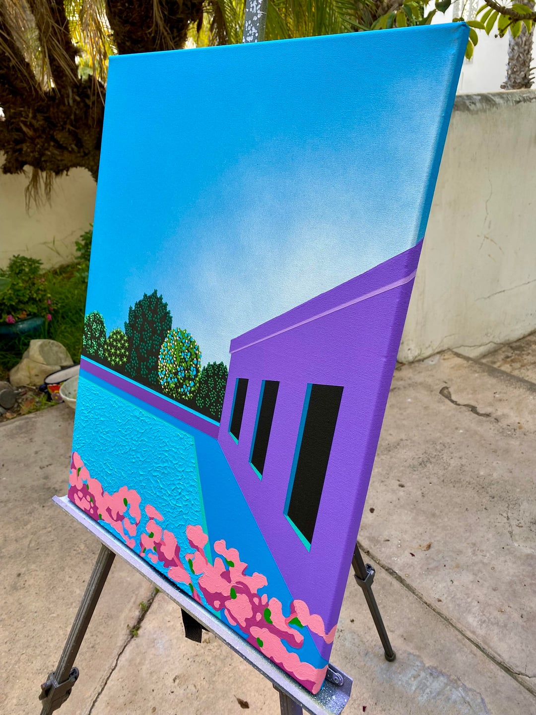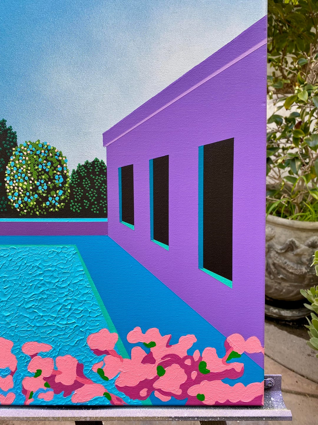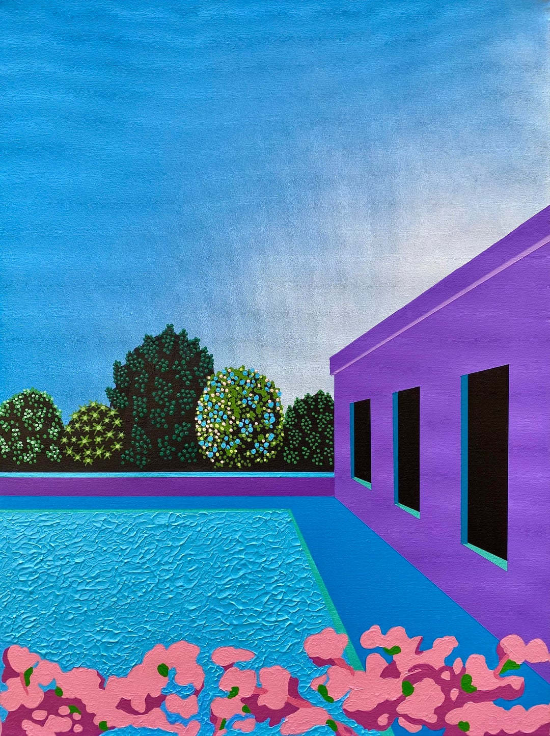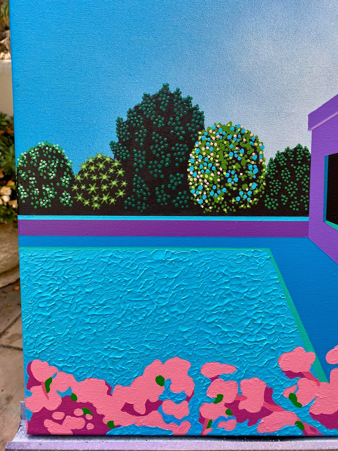 1980年代のアーティスト、永井博のスタイルのプールハウスのアクリル作品
