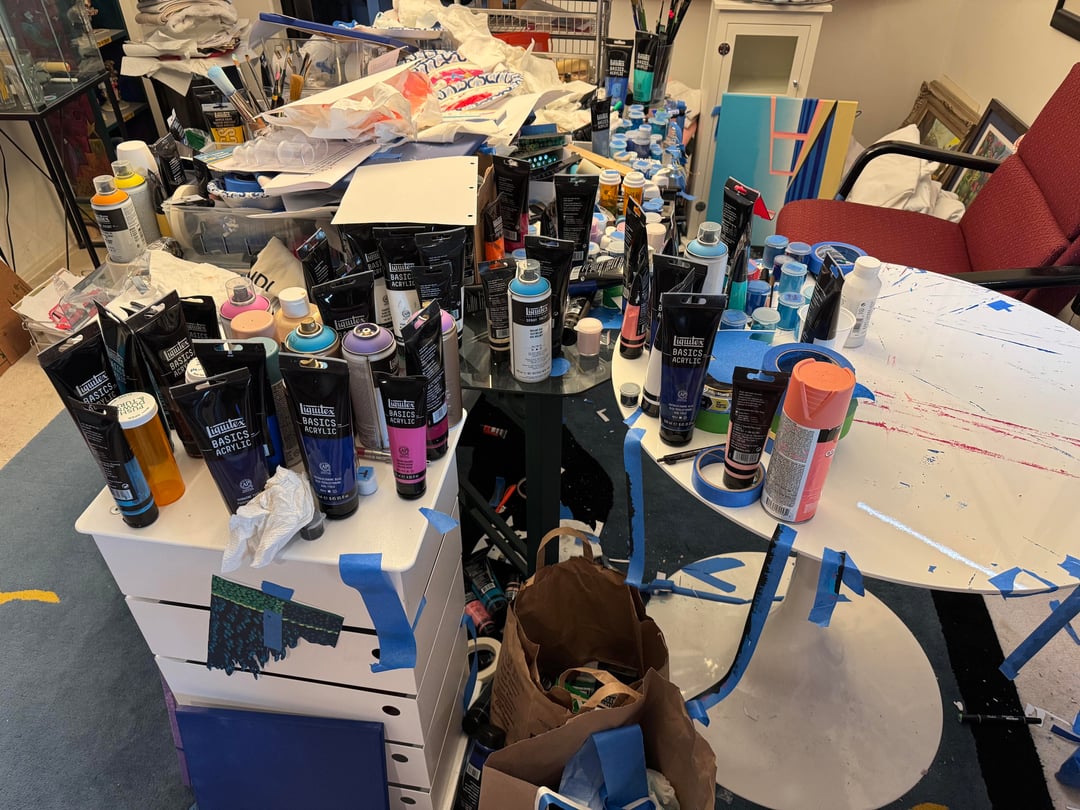 プールサイドの花。水面は穏やかです。空気は静止しています。沈黙が響き渡る。コットンキャンバスにアクリル。