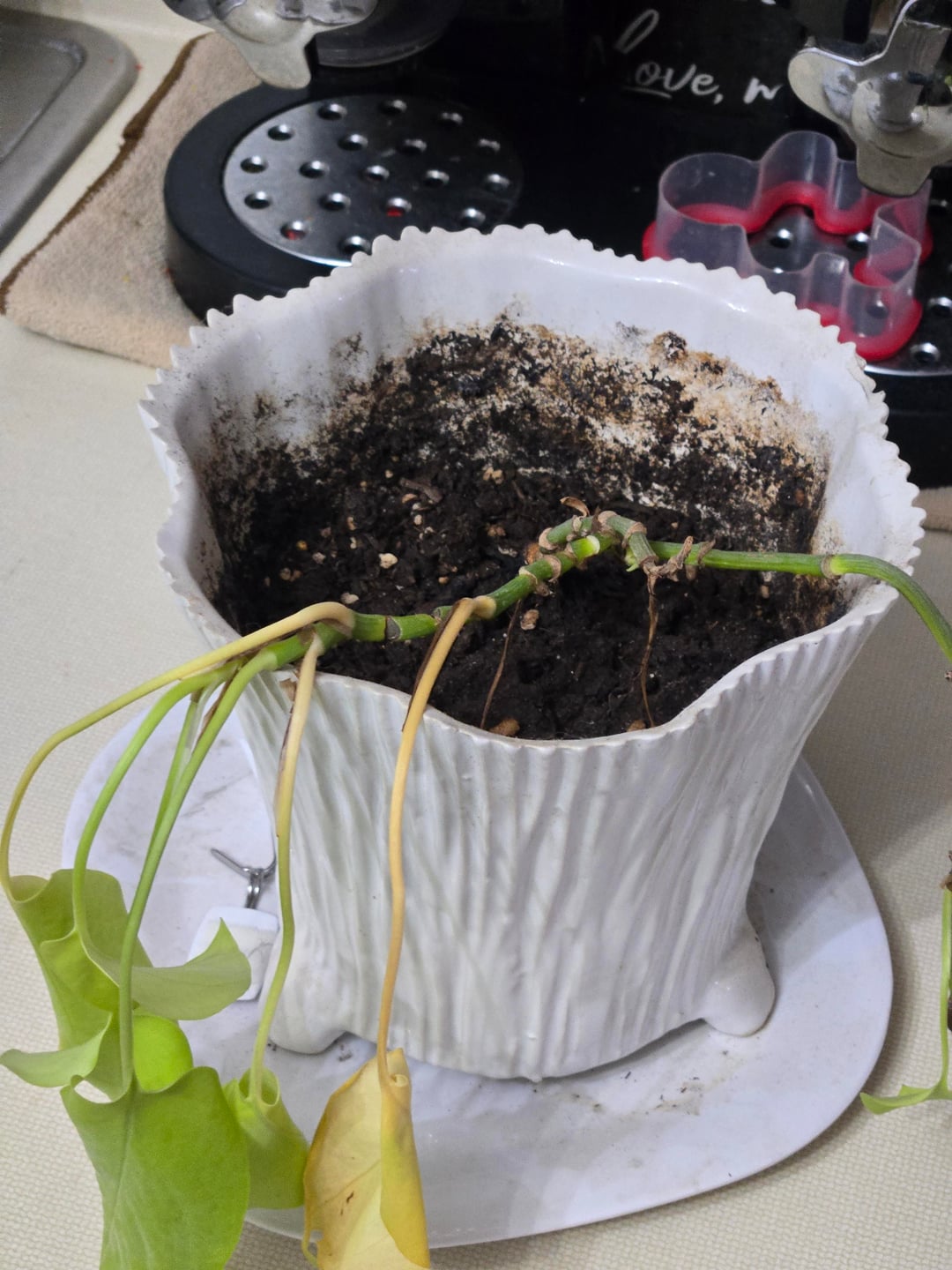 まず、私は植物があまり得意ではありません。今日の初めに妹が植物を拾って世話をしてもいいですかと私に尋ねたので、取りに行ったとき、この状態でした。最初はただ捨てるつもりだったのですが、その後の裏話を知らされたので、今は可能であれば本当に育てて健康に戻したいと思っています。基本的にこの植物は20年近く前から存在していて、以前は私の叔父のもので、その後叔父が私の母に譲り、その後私の妹がそれを手に入れることになりました。聞いたところによると、昔は大きかったそうです。したがって、基本的にどこから始めればよいのかわかりません。これも何の植物なのか分かりません。私が絶対にやろうとしている唯一のことは、このポットには排水穴がないので、別のポットを購入することです。特別な土を使用する必要があるのか、それとも何か役立つものを入手した方がよいのかわかりません。この植物を育ててまだ数時間しか経っていないので、できるだけ早く何かをしたいと思っています。
