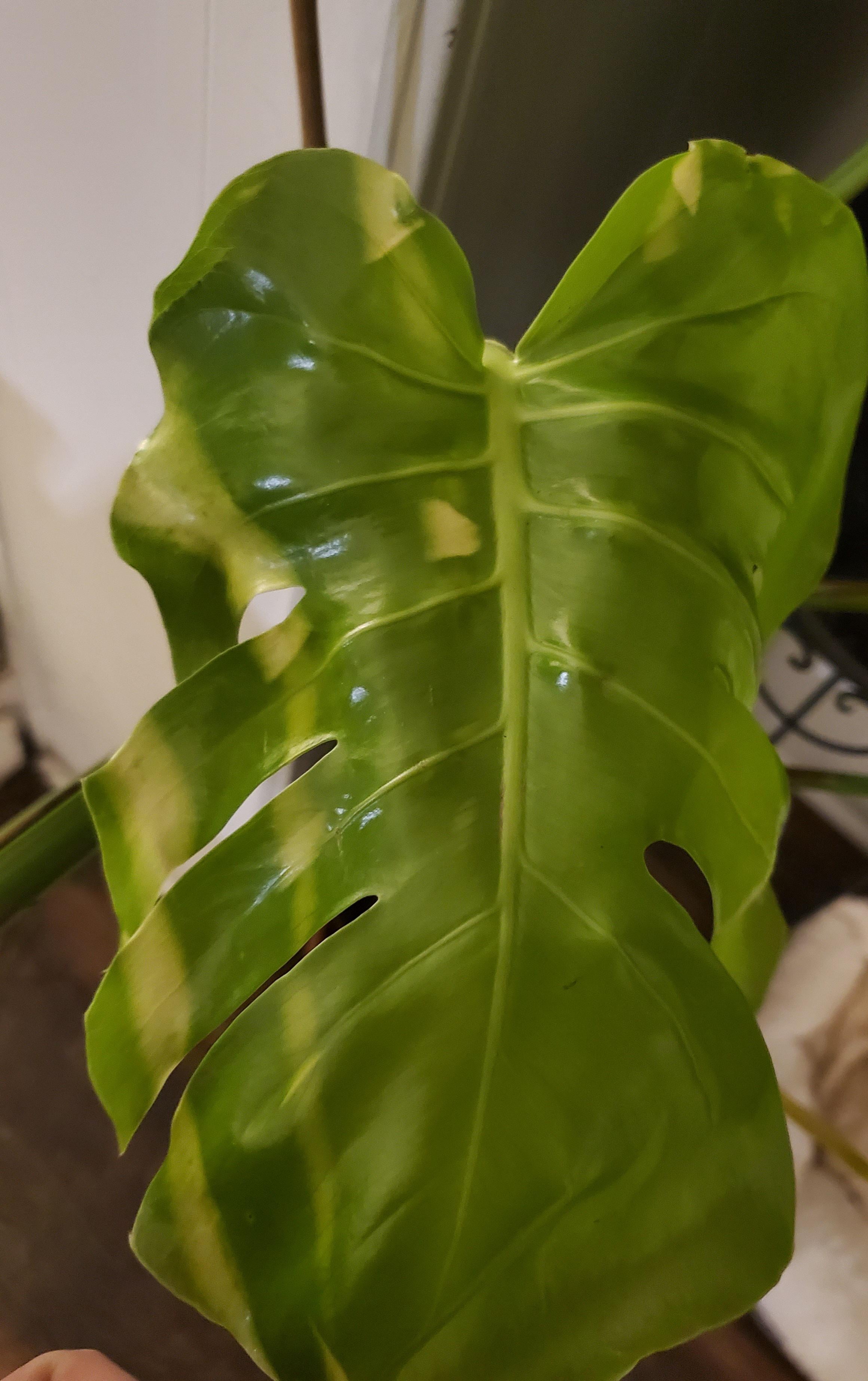それは1か月以上前に出現し、広がり始めたばかりです。冬の間室内に置いてあり、別の葉も飛び出してきましたが、このような変色はありません。両方とも日光に向かって横に移動しました。 他のモンステラは水のやりすぎではないと思いますが、見た目は普通ですが、単に光が足りなかったり、水やりが足りなかったりするのでしょうか?