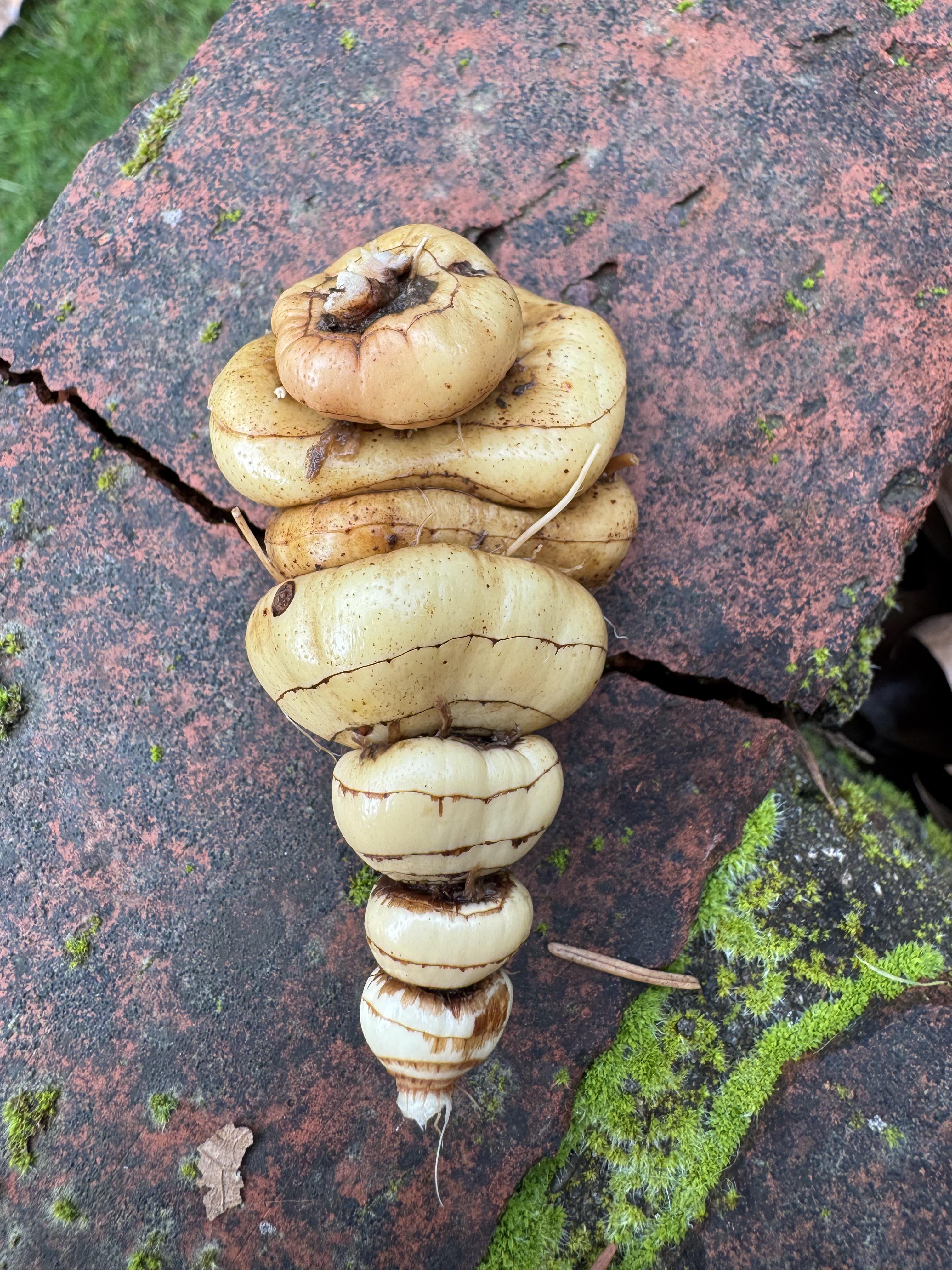 これが何の種類の植物であるかを特定するのを手伝ってくれませんか?観賞用の草だと思って掘り起こしてみると、土の中に球根が大量にありました。