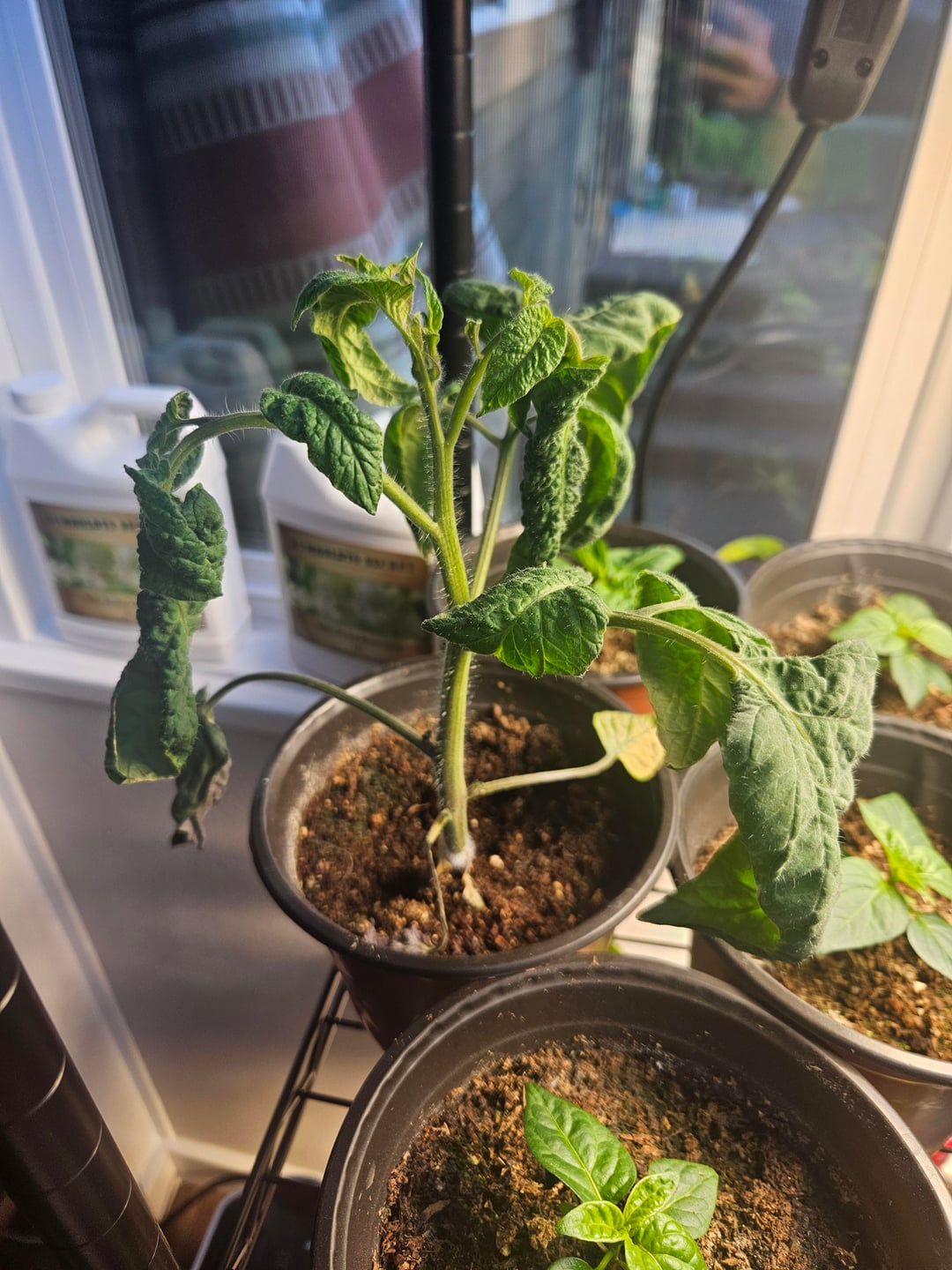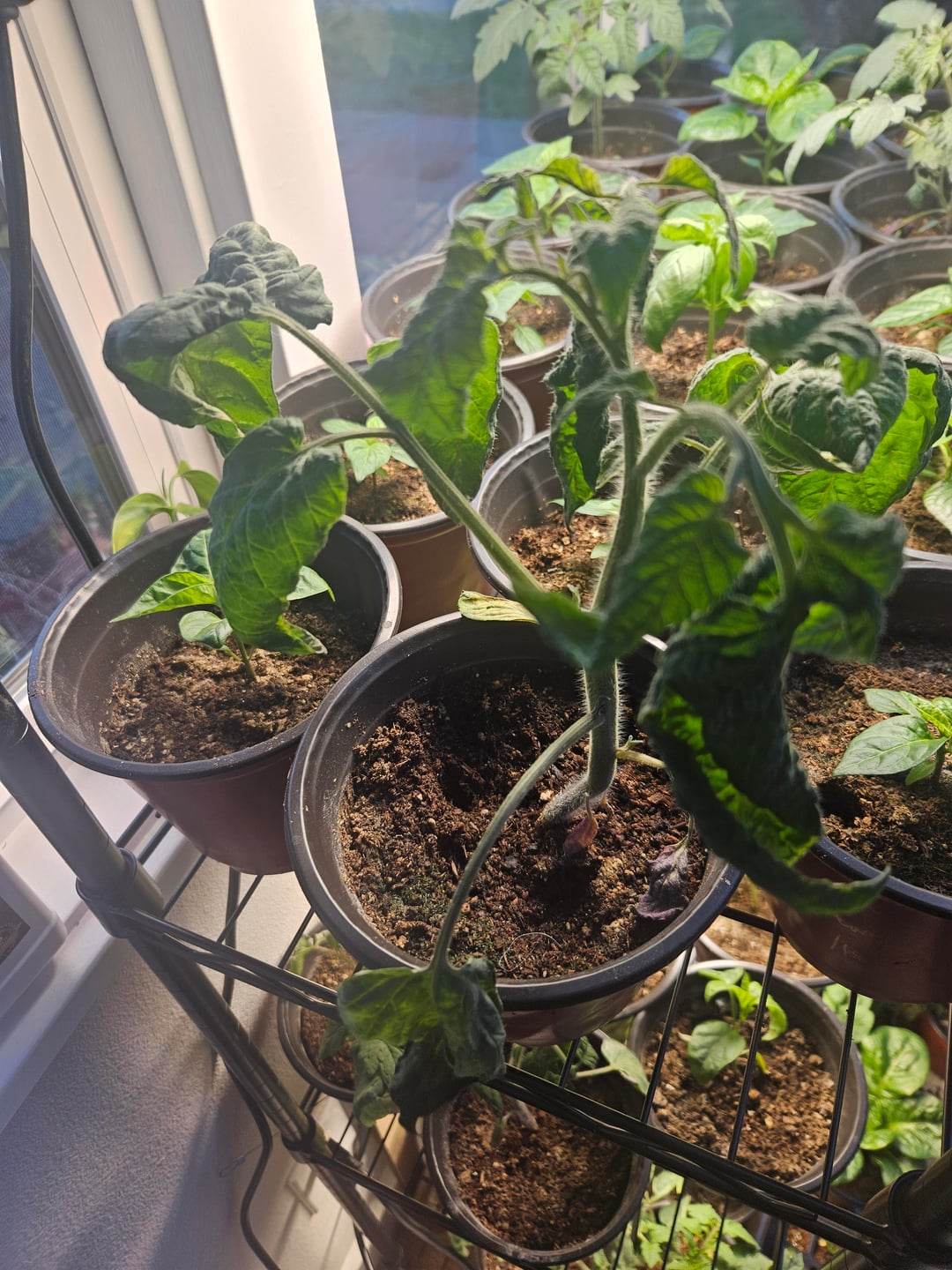 水やり過ぎだと思います。葉がカールしている病気ではないといいのですが…昨年のブランディワインは若干カールしていたのを覚えていますが、ここまでではありませんでした。