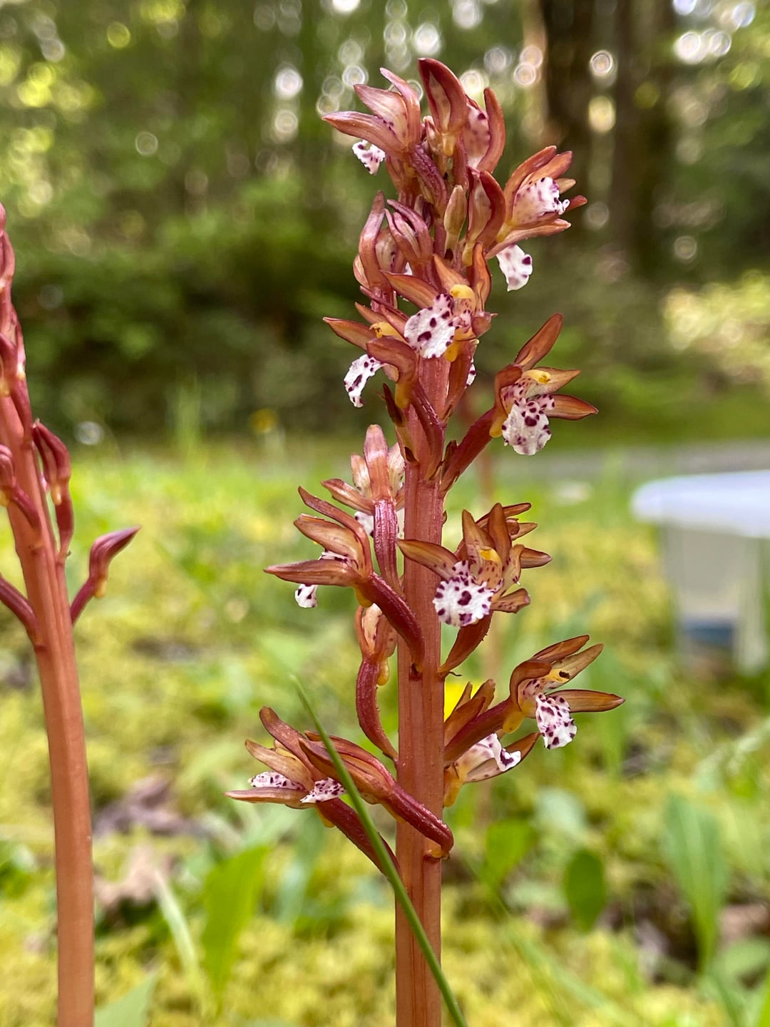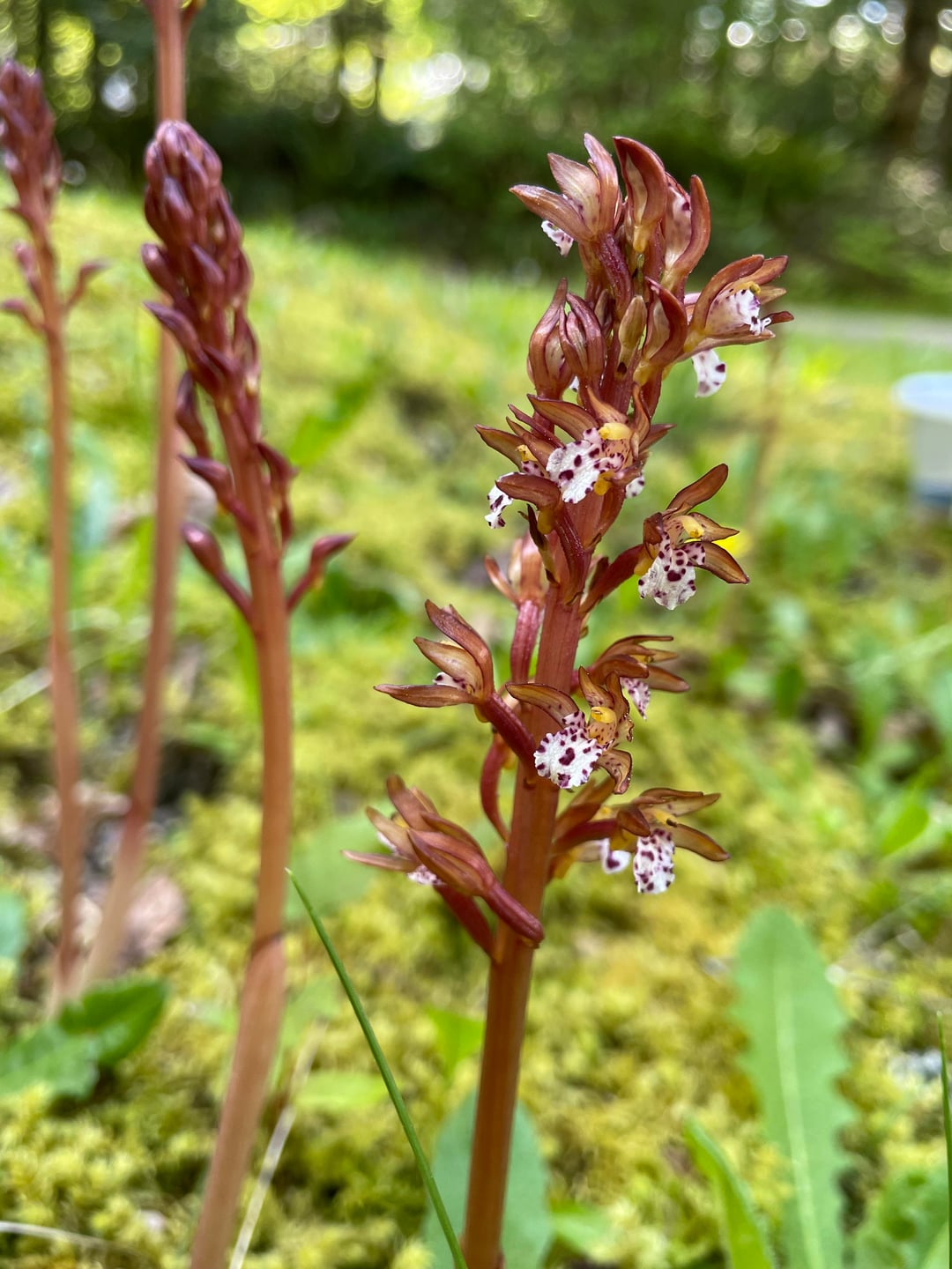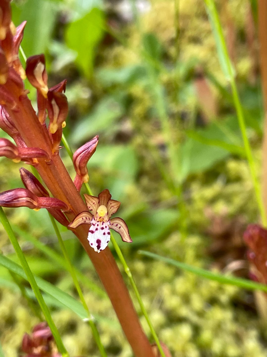 斑点サンゴ根 (Corallorhiza maculata) は菌従属栄養植物です。つまり、隣接する他の植物を接続する菌糸体に寄生することによって、それらの植物から栄養分を引き出します。私はこの植物がとても大好きです。 これらの写真は 2025 年 5 月に撮影しました