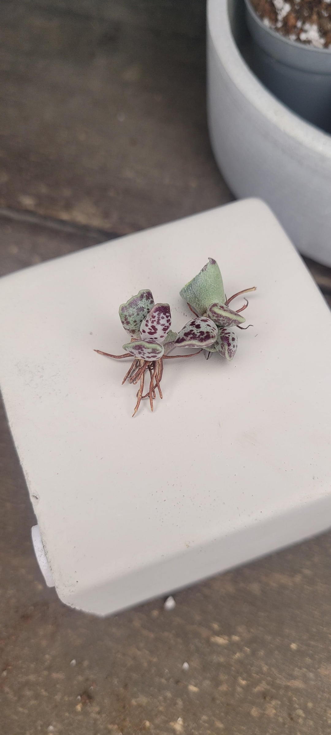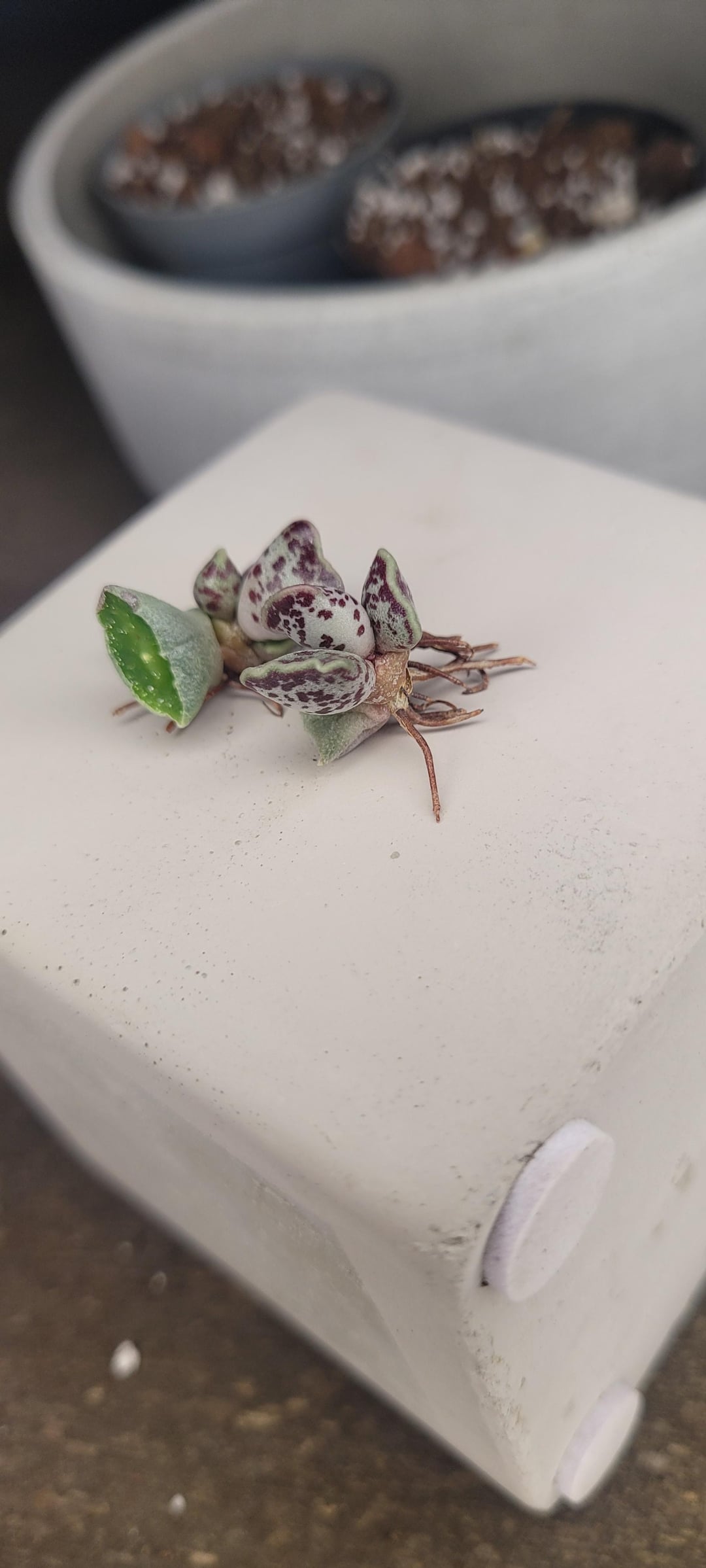 それで今、私は2匹の美しい赤ちゃんの子犬を飼っていて、その斑点が大好きで、彼らが成長するのを見るのが待ちきれません🥲 簡単な手術をして、根が分離しないように鱗屑の損傷があった場所まで母葉を取り除き、いくつかのカルシングの後、鉢植えにして観察する予定です💚