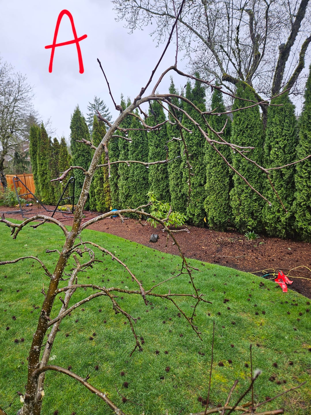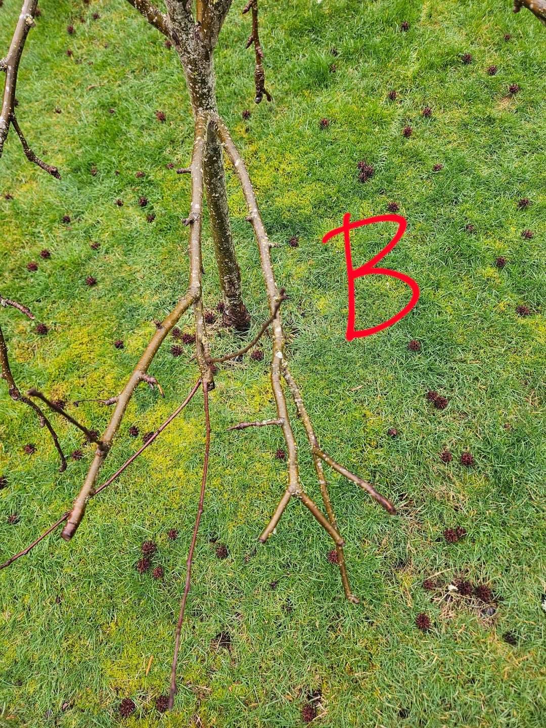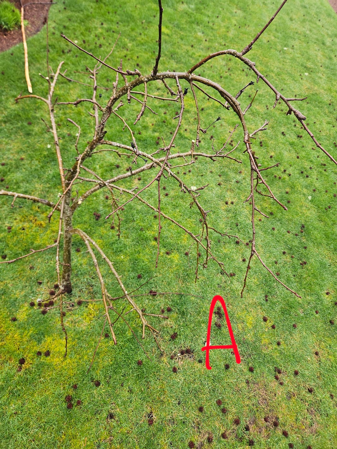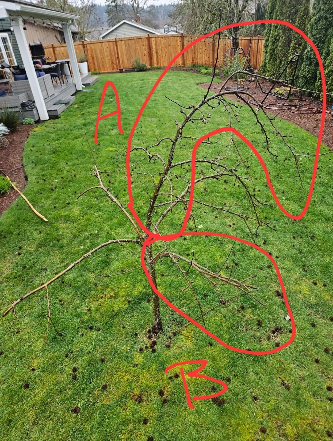 今年はすでに縦枝を剪定してきました。しかし、交差と混雑を最小限に抑え、オープンミドルを作成し続けるという点で、ツリーの特定の部分をどのように処理すればよいかわかりません。私が疑問に思っているのは、中央のリーダーとその多数の枝 (A) と、下部の密集した 2 つの枝 (B) です。これらの部分に対処する方法についてアドバイスをいただければ幸いです。