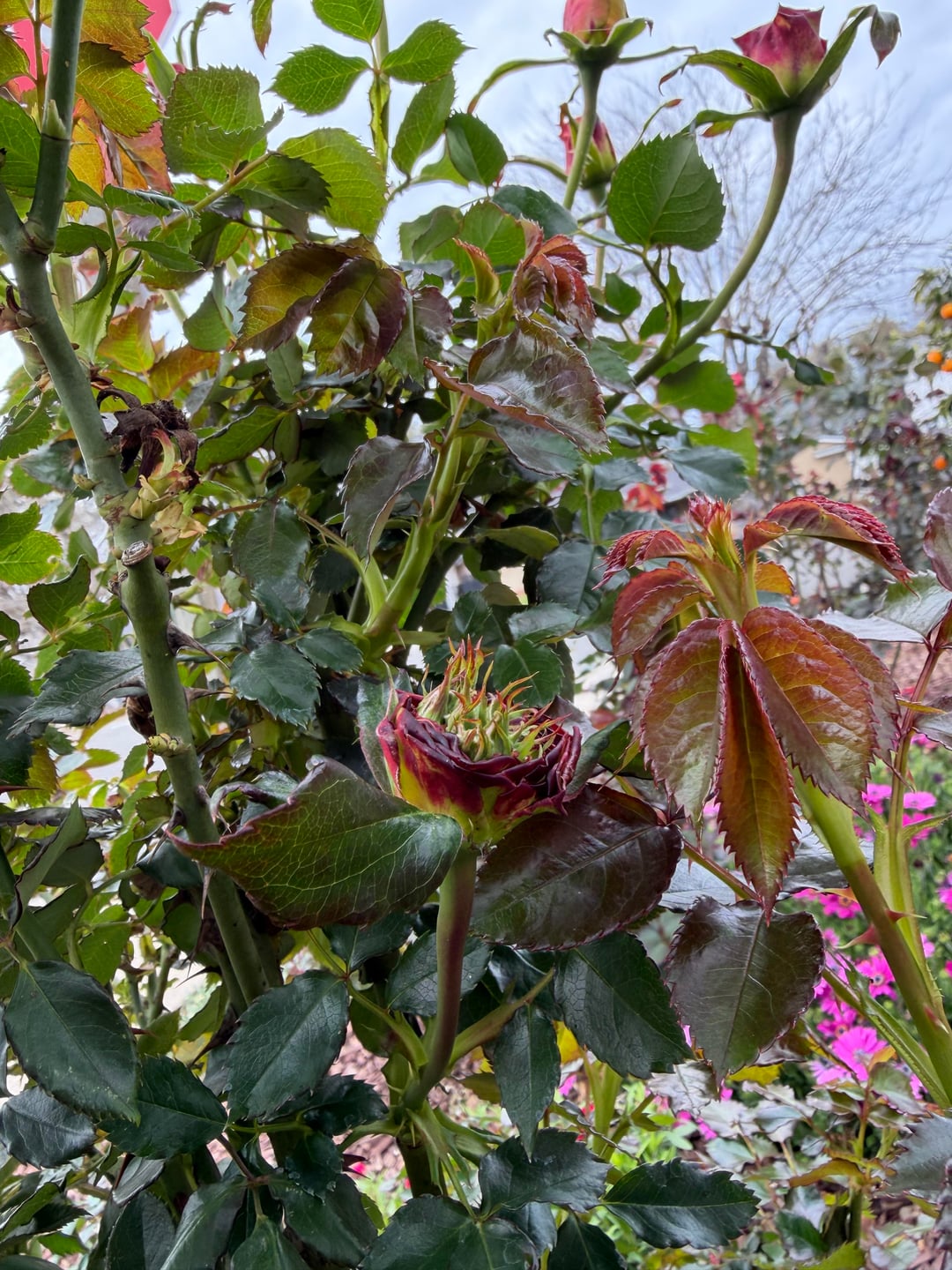 私はバラの植物にこの不規則な成長を見て、その成長の様子を写真に撮ることにしました。このようなことに詳しい方、ぜひご教授ください
