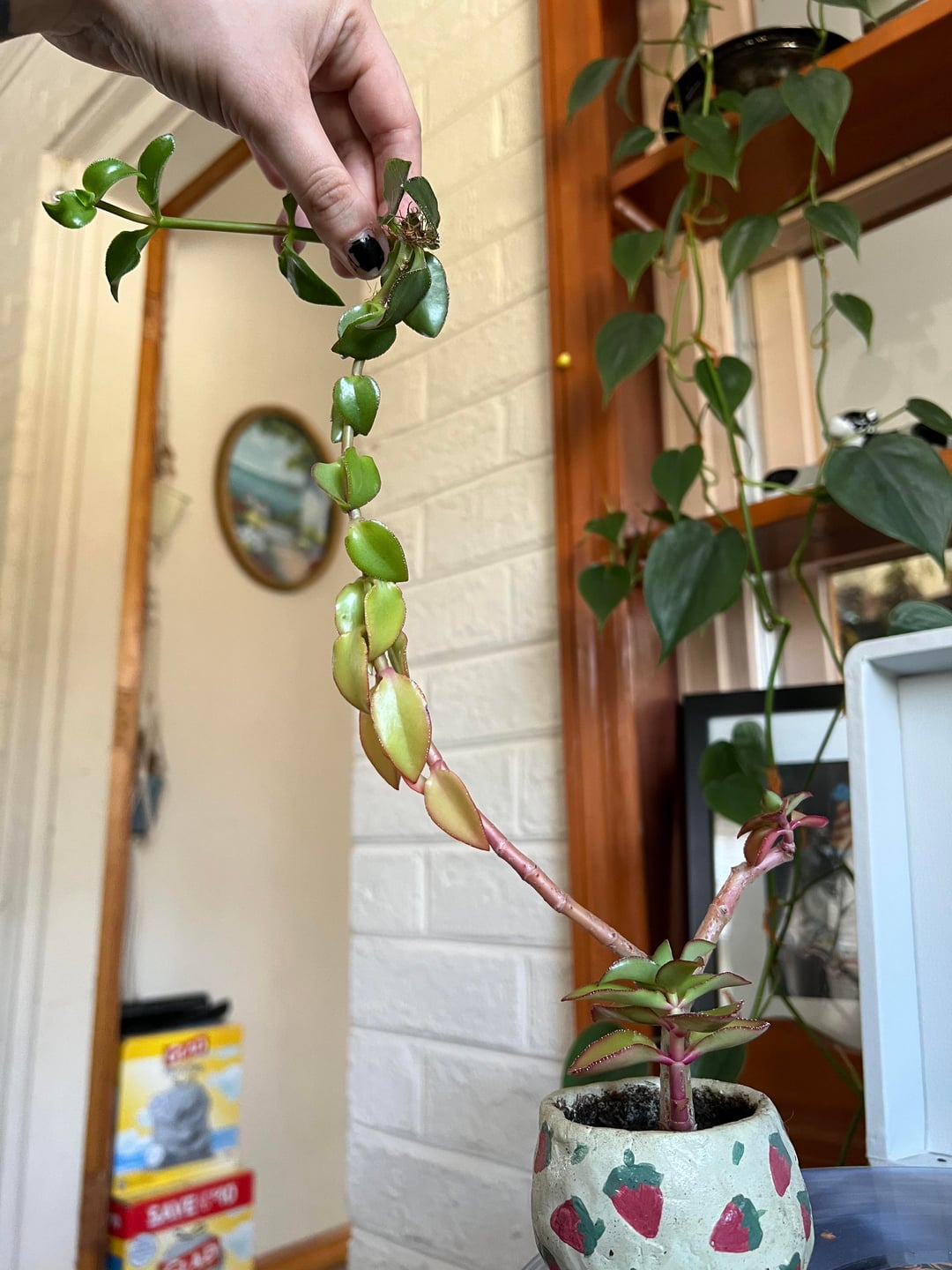 私のヒスイの植物(?)をどうすればいいのかわかりません。まず、鉢が小さすぎることはわかっていますが、何年もそこに置いてあり、特に問題はありません。でも、一本だけ長い茎が気になる?非常にぎこちないように棒に結びつけるべきでしょうか?切り取って広める?鍋が問題ですか?それとも垂れ下がった植物なので大丈夫でしょうか?
