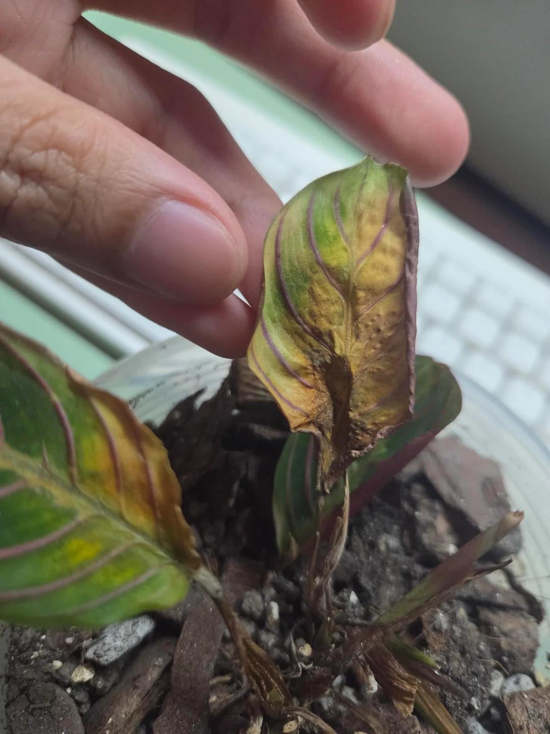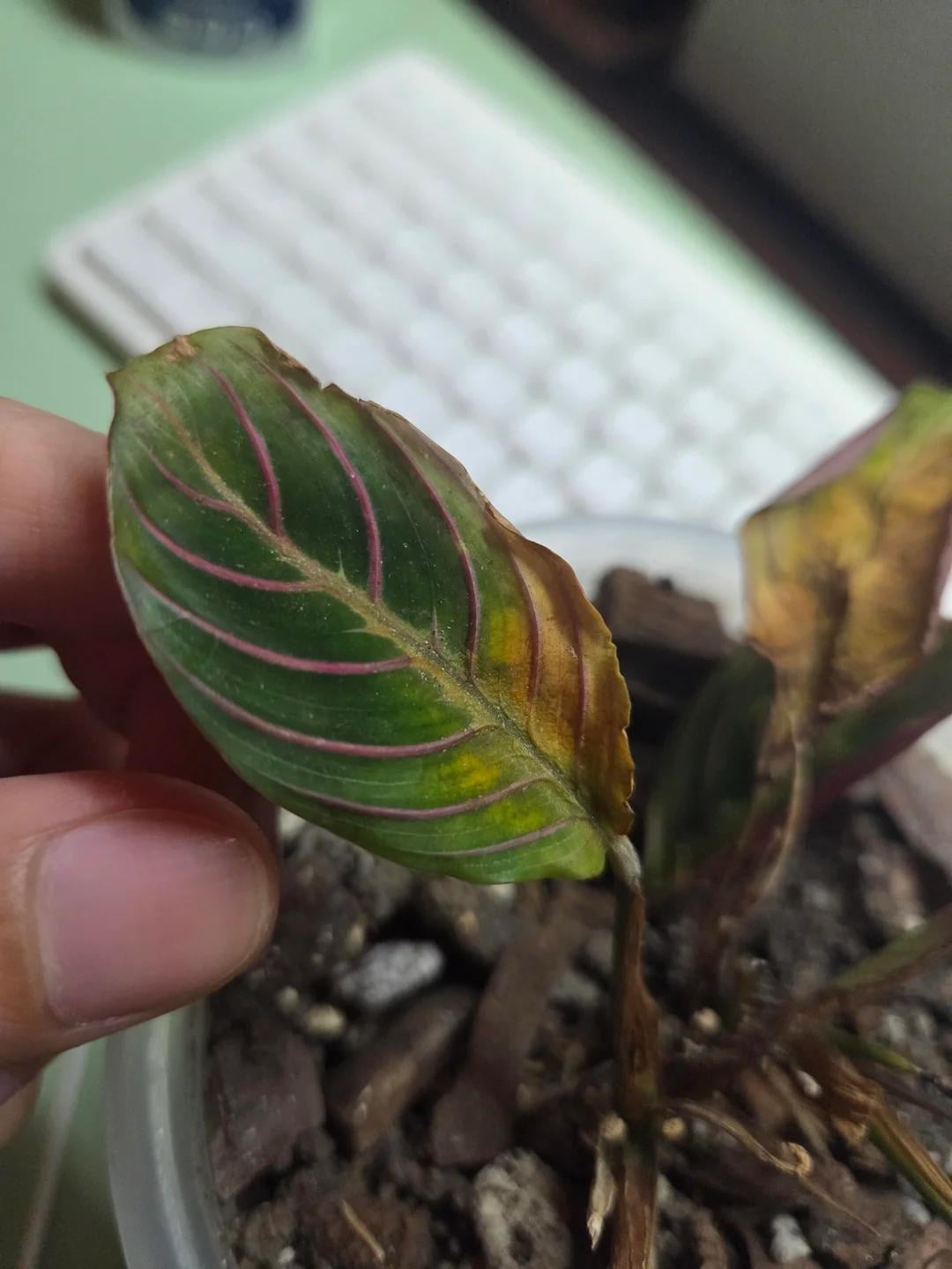 私の赤ちゃんマランタは葉を維持できないようです。これは数週間後に起こるためです。葉の内側が黄色くなり、葉全体に広がり、カリカリになります。