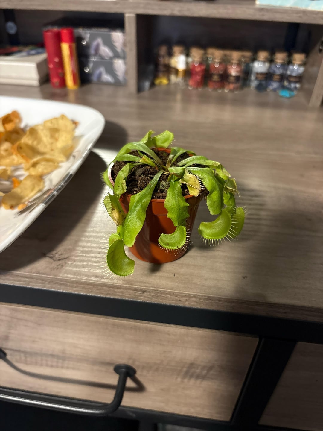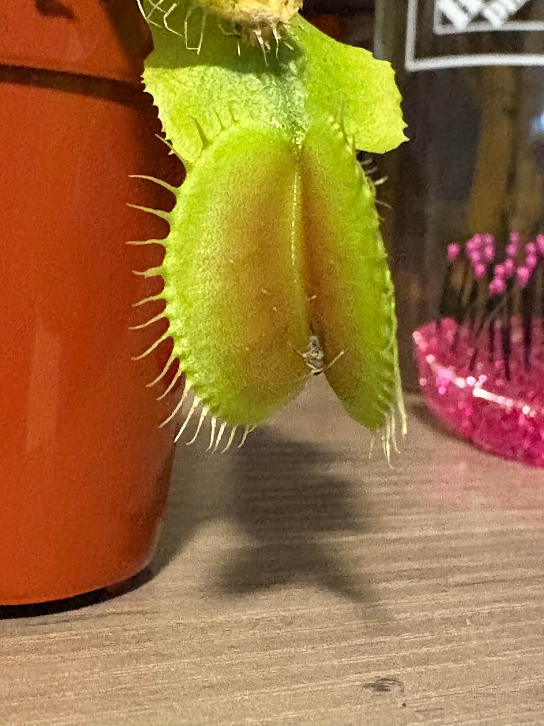 (写真を撮るために彼を窓から移動させました)それで、今朝起きると、彼がとても垂れ下がっているように見えました。心配すべきですか、それともこれは正常ですか? 今日仕事が終わったら、もっと大きなものに植え替えようと思います。 トラップの 1 つにハエが死んでいるのに気づきましたが、トラップがまったく閉まっていません。これは正常ですか?