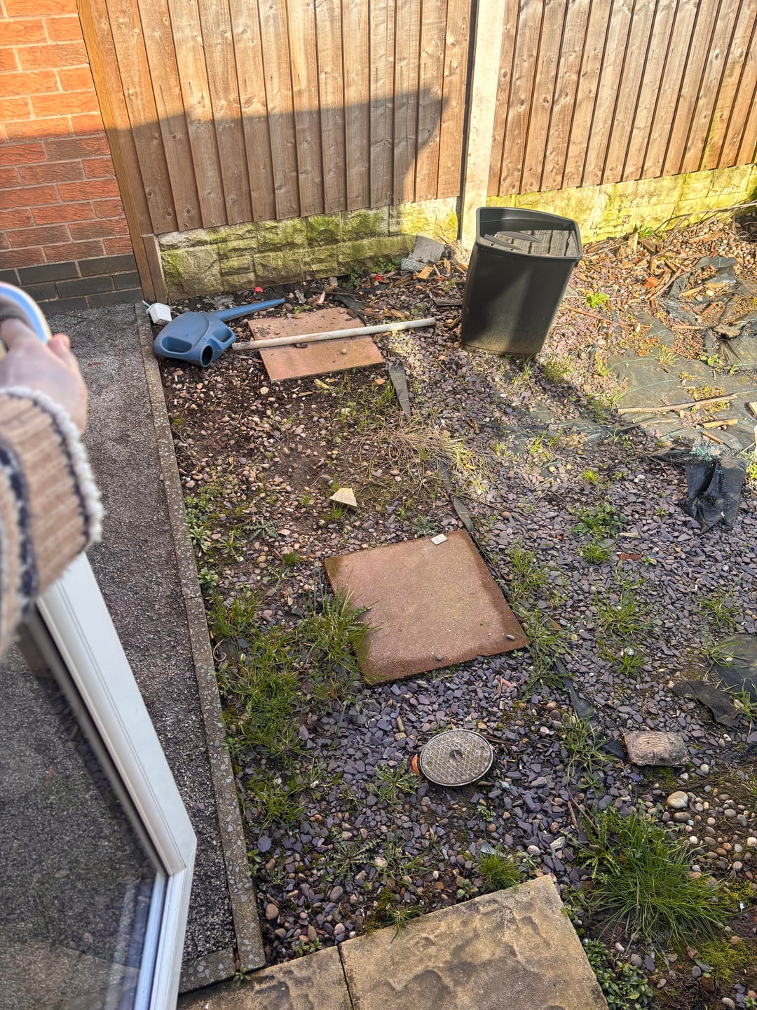 私たちの目標は、新しい新鮮な草を敷き、その脇にいくつかの花壇を置き、庭をまずまずの水平にすることです。また、生垣の前にある奇妙なランダムなスレートのように見えるパッチをどうするかを考えたいと思います。