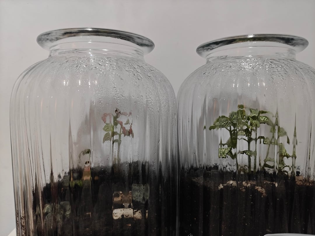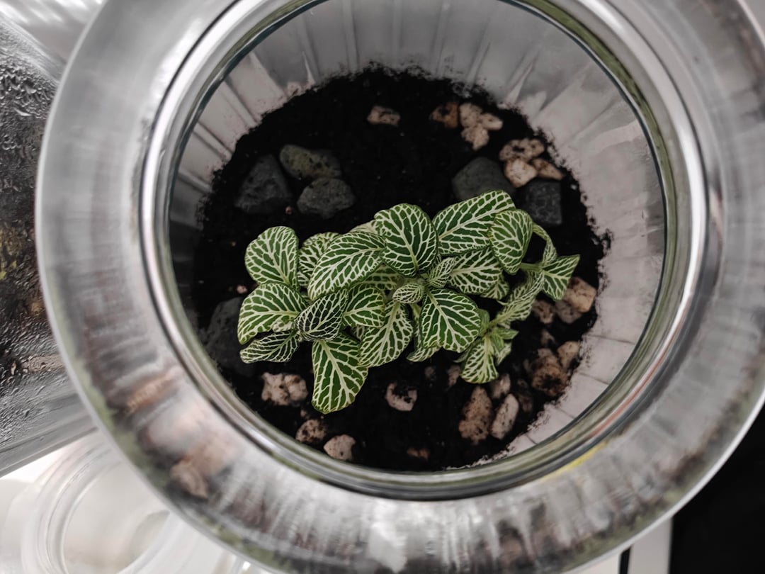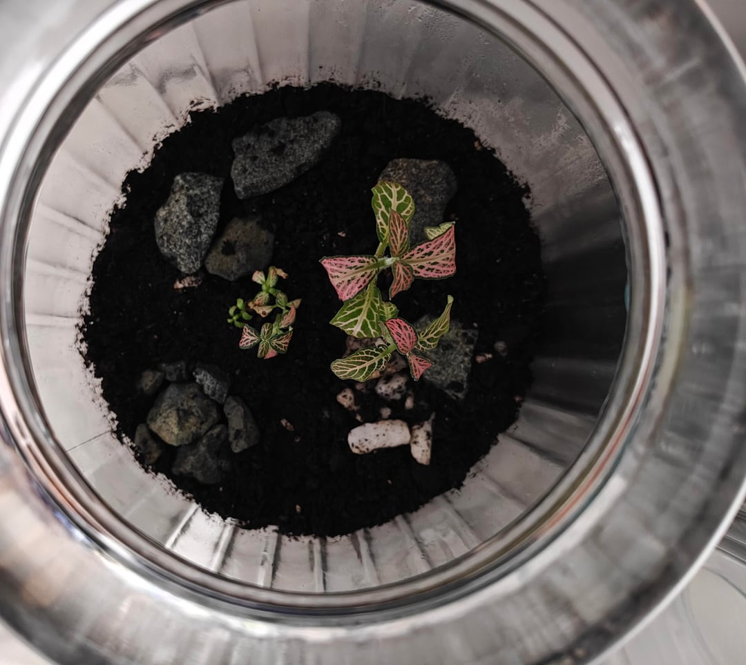 ここに投稿した最後の投稿を参照して、湿気の問題に対処するために密閉瓶を 2 つ与えました。最初は水を入れすぎたにもかかわらず (ストレスになりました)、それらの問題は最終的には解決されました。 しかし、彼らは健康そうに見えますか?ピンクのフィットニアは葉がとぐろを巻いていて(でも湿度も水分量も十分高いはずだし、窓が近くても直射日光が当たらないので(電気をつけて夜更かしするときは毛布をかけたりもします)、ちょっと心配です。