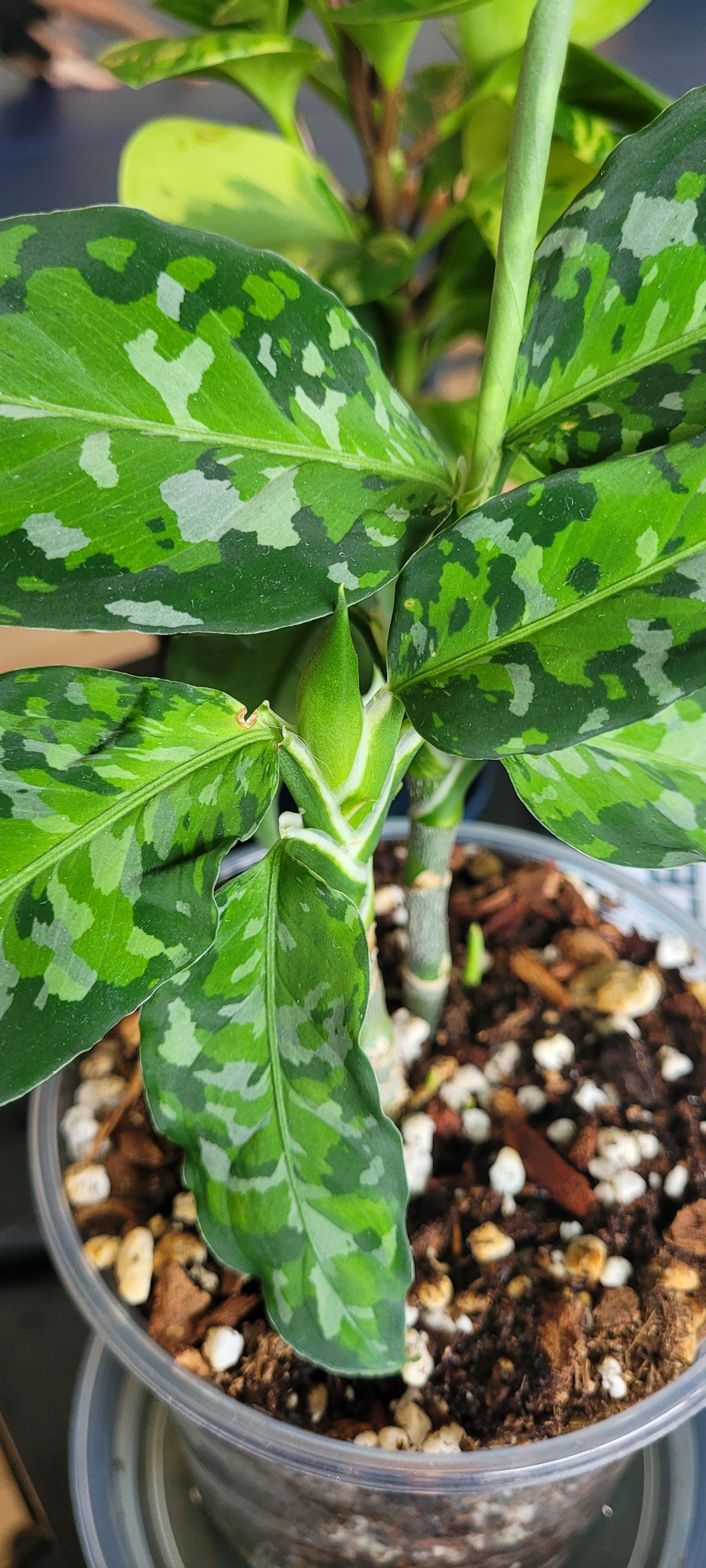 私のアグラオネマはいくつかの新しい葉を出していますが、中心にこの絶対的なチョーカーも出ています。これは史上最も厚い葉なのでしょうか?これは何ですか?これはもうステムですか? 超低湿度の期間が続いているので、ストレスマークの一部は無視してください。助けを求めていますので、心配しないでください 🥲