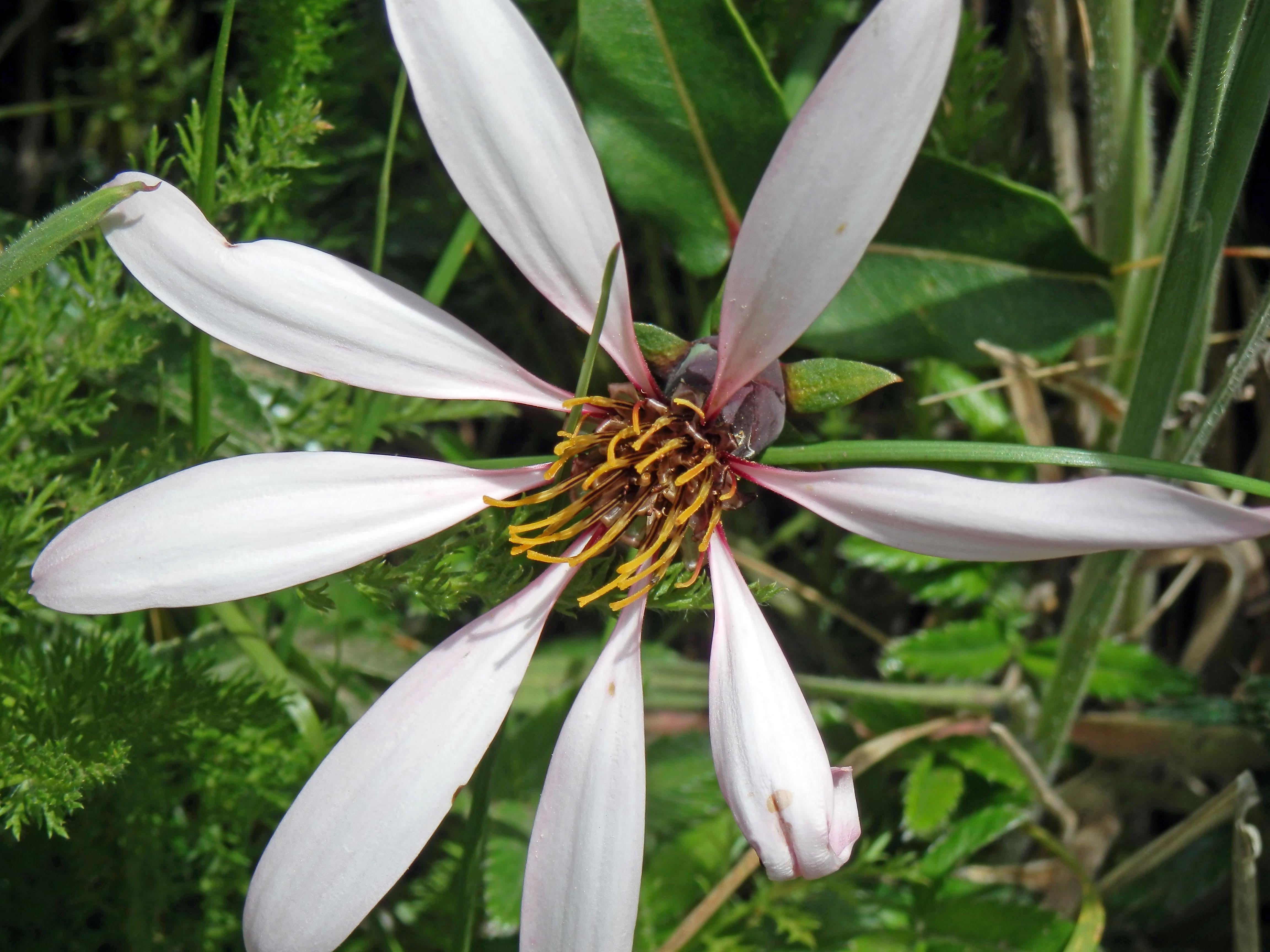 綺麗な写真を撮りました ムティシア (おそらく ムティシア・ラティフォリア)朝の散歩中に! 📸 独特の淡い花びらと複雑な中心部が緑の中でとても目立ちます。 🌿