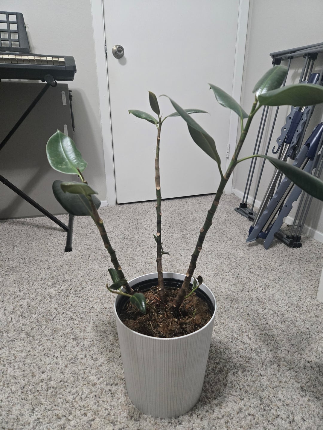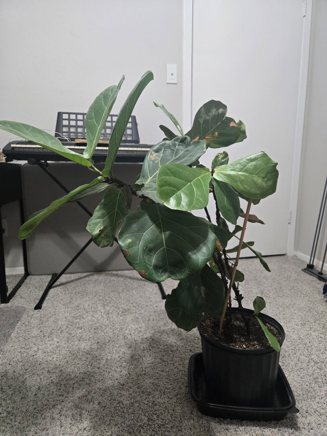 大きなフィドルリーフイチジク: これは死ぬほど乾燥していて、杭がないと立ち上がらないでしょう。少し大きめの鉢に植え替えて、水に浸けて杭を打つ予定です。