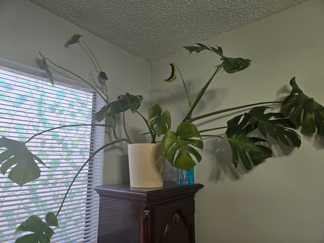 モンステラ:枯れた葉と、既存の葉の乾燥/焼けた部分を切り取ります。苔のポールを立てて登れる大きめの鉢に植え替えます。