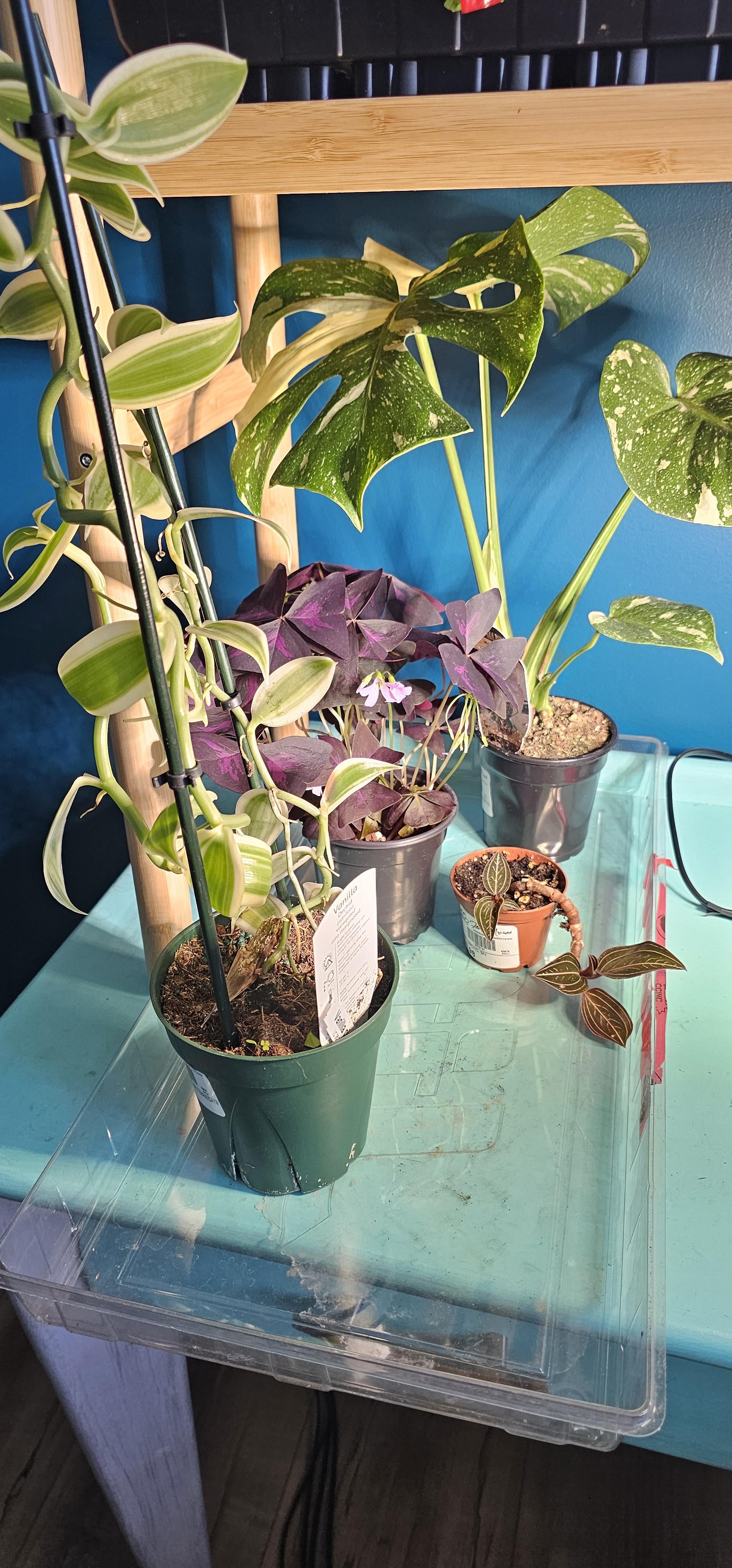 数日前、壁を登っている素晴らしいモンステラ・アダンソニーの投稿を見て、これが必要だと決心しました。 そこで店に買いに行ったのですが、在庫がありませんでした。それで私はモンステラタイ、バニラオーキッド、ジュエルオーキッド、パープルカタバミで落ち着きました。 観葉植物を腕に抱えていると、またしても虚ろな目で妻たちと目が合った……。 次回はモンステラ・アダンソニ、次回。