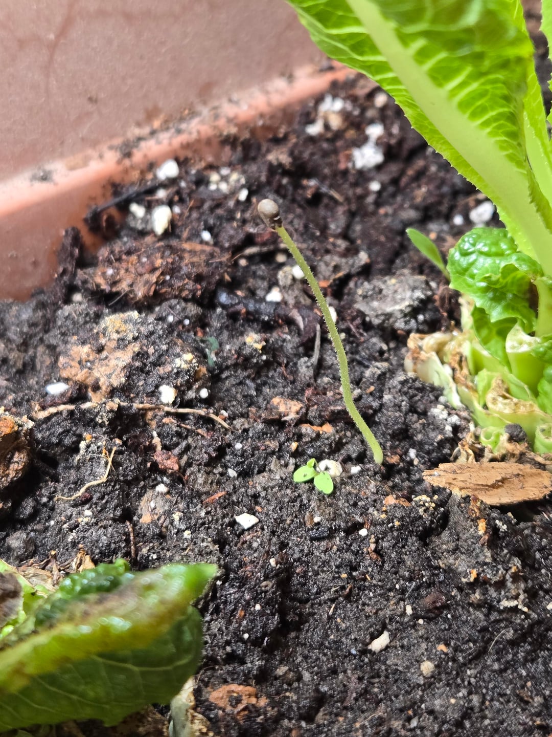 こんにちは、私は屋内ガーデニングにはやや初心者です。私の好きなことは、店で売られている果物や野菜から得た端材や種から何かを育てることです。私はロメインレタスの底が入ったトレイを持っています、そしてこの小さな種は成長しています。 "これをイメージしてください" 植物 ID アプリではキュウリだと言われていますが、私は懐疑的です。どんなアイデアでも歓迎します