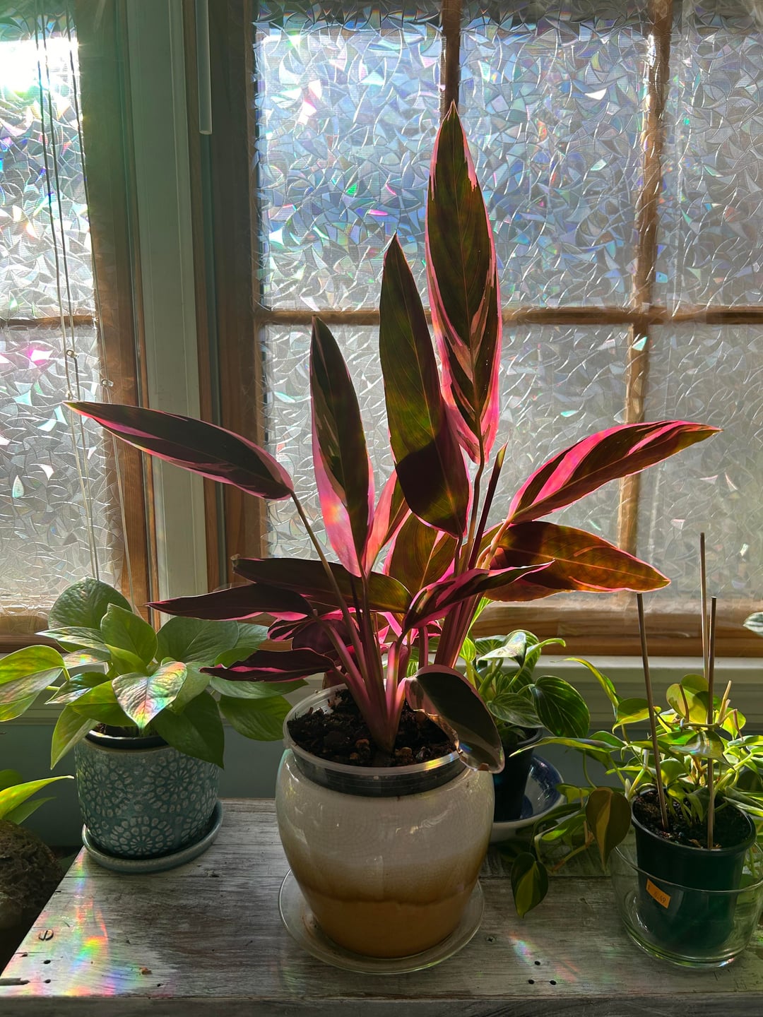 ところどころ葉が落ちてしまいましたが、全体的にはとても幸せそうです!以前は葉っぱがもっと舞っていましたが、今は窓の方を向いたままです。私が持っているお気に入りの植物の 1 つです。母が食料品店で見つけて、私に買ってくれました。その日まで私はストロマンテについて何も知りませんでした。見事な植物。彼女がどのように成長し続けるかを見るのが待ちきれません