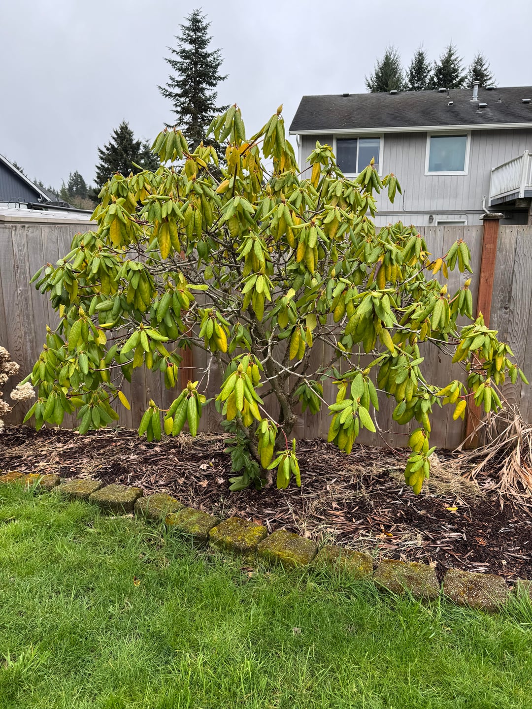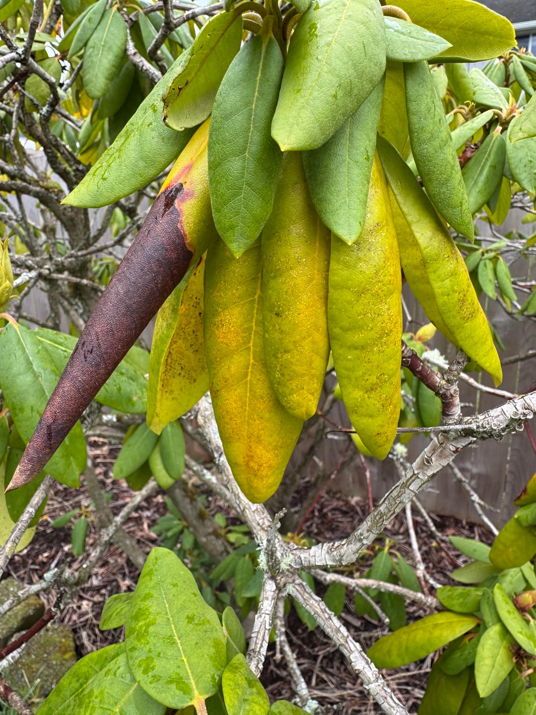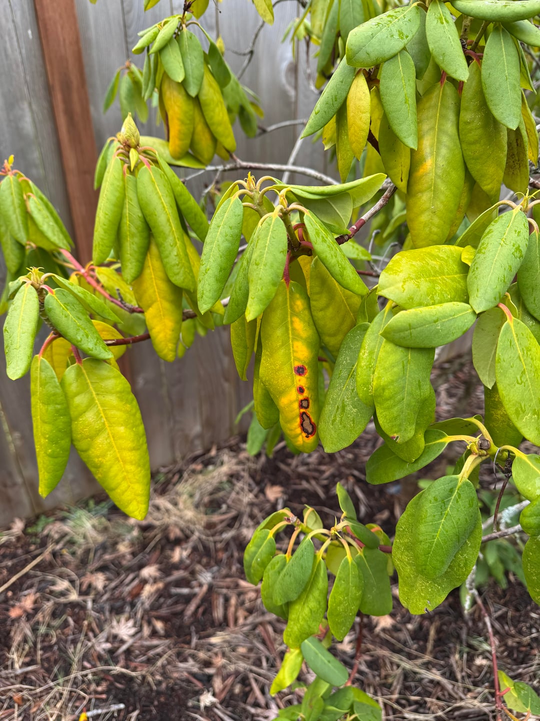 写真#1-3は問題のシャクナゲです。写真 #4 は、比較用に撮ったもう 1 つのはるかに健康そうなシャクナゲです。 ご覧のとおり、色はよりライムグリーンに見えます。 土壌のPHは酸性で、彼らの好むものと完全に一致しているようです(おそらく5.5)。 昨年は追肥をしたと思います。肥料が多すぎるように見えますか? PNWに住んでいます。この家に住んで2年目なので冬はこんな感じでしょうか?