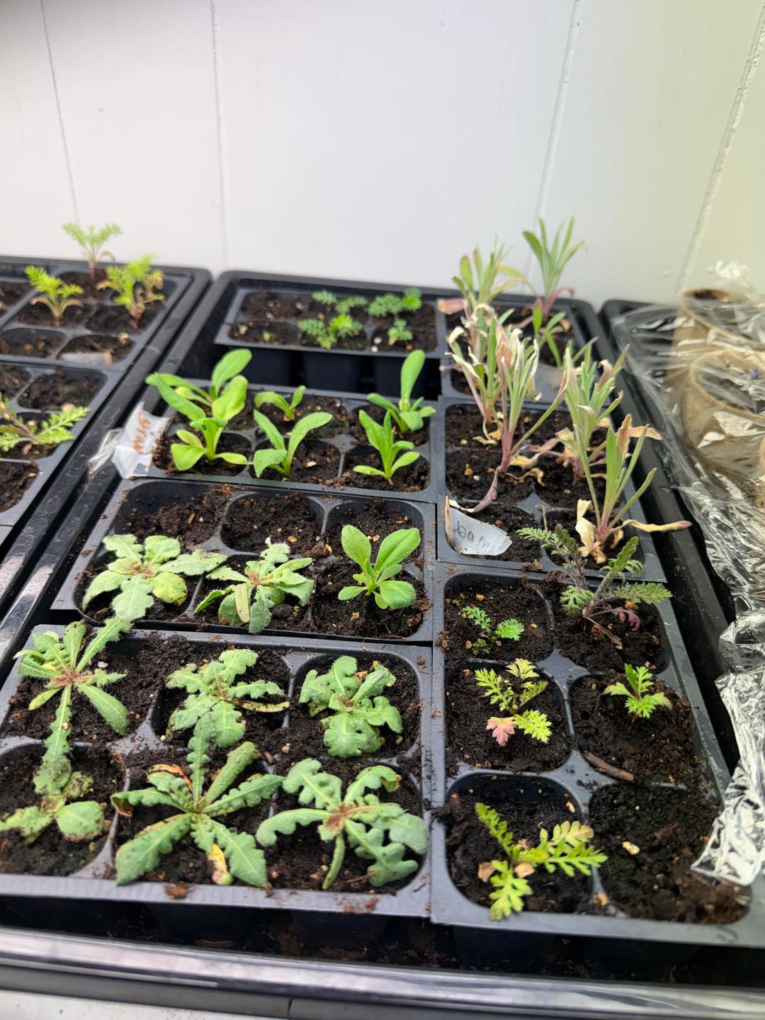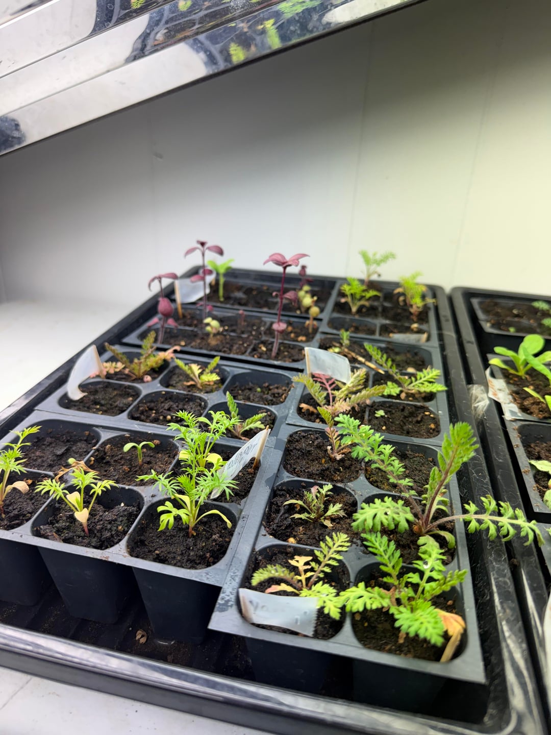 これらの植物のほとんどは1月中旬に苗として育て始めました。私はノコギリソウ、バチェラー、ボタン、ストロー、花、スナップ、ドラゴン、そしてスターチスを持っています。 彼らは大きな蛍光灯の下で16時間過ごします。光は植物の上約3インチに保たれます。毎日水が与えられます。光の下での温度は約75°です。肥料は一切使用していません。それらは種まき用の土の中にあります。ブヨがいくつかいますが、それが成長に影響を与えるはずはないと思います。 初めてやりましたが、成長が止まっているような気がします。