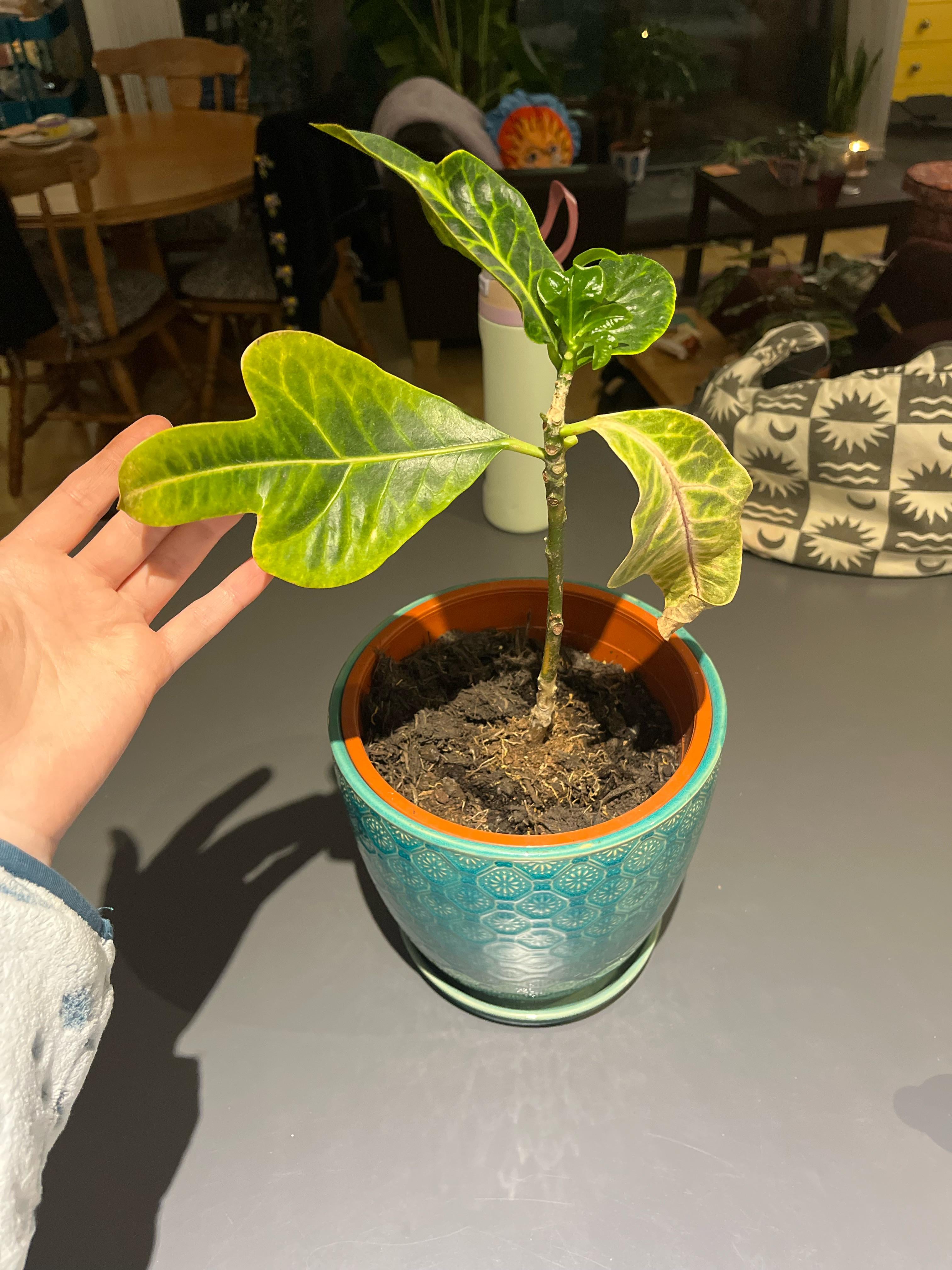 このクロトンに何が起こっているのか分かりません。底から餌を食べていますが、葉はすべて右のように回転してから落ちています。上部に新しい芽がいくつか出ていますが、切って支柱を立てる必要がありますか?だとしたら、水の中か土の中か…?