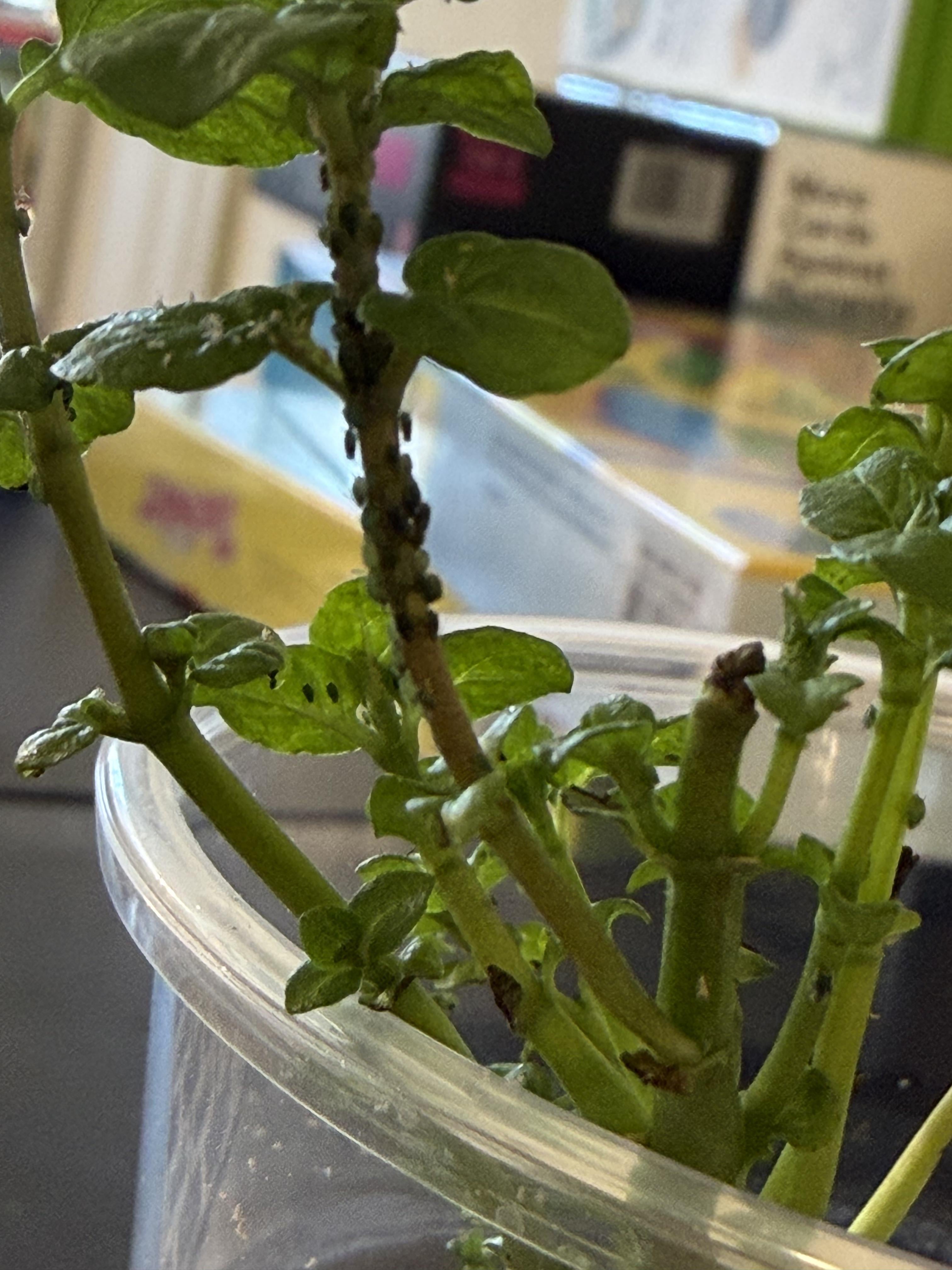 これはチョコレートミントから切り取ったもので、1週間放置していましたが、戻ってきたら緑色の虫がたくさんいました。葉っぱに白いアブラムシがついてしまい、駆除しようと思っています。石鹸と水を試したり、水に浸したり、指を使って押しのけたりしてみましたが、何も効果がありませんでした。誰かが昆虫の提案と識別、そして解決策を持っていれば、私は非常に感謝します。ありがとう