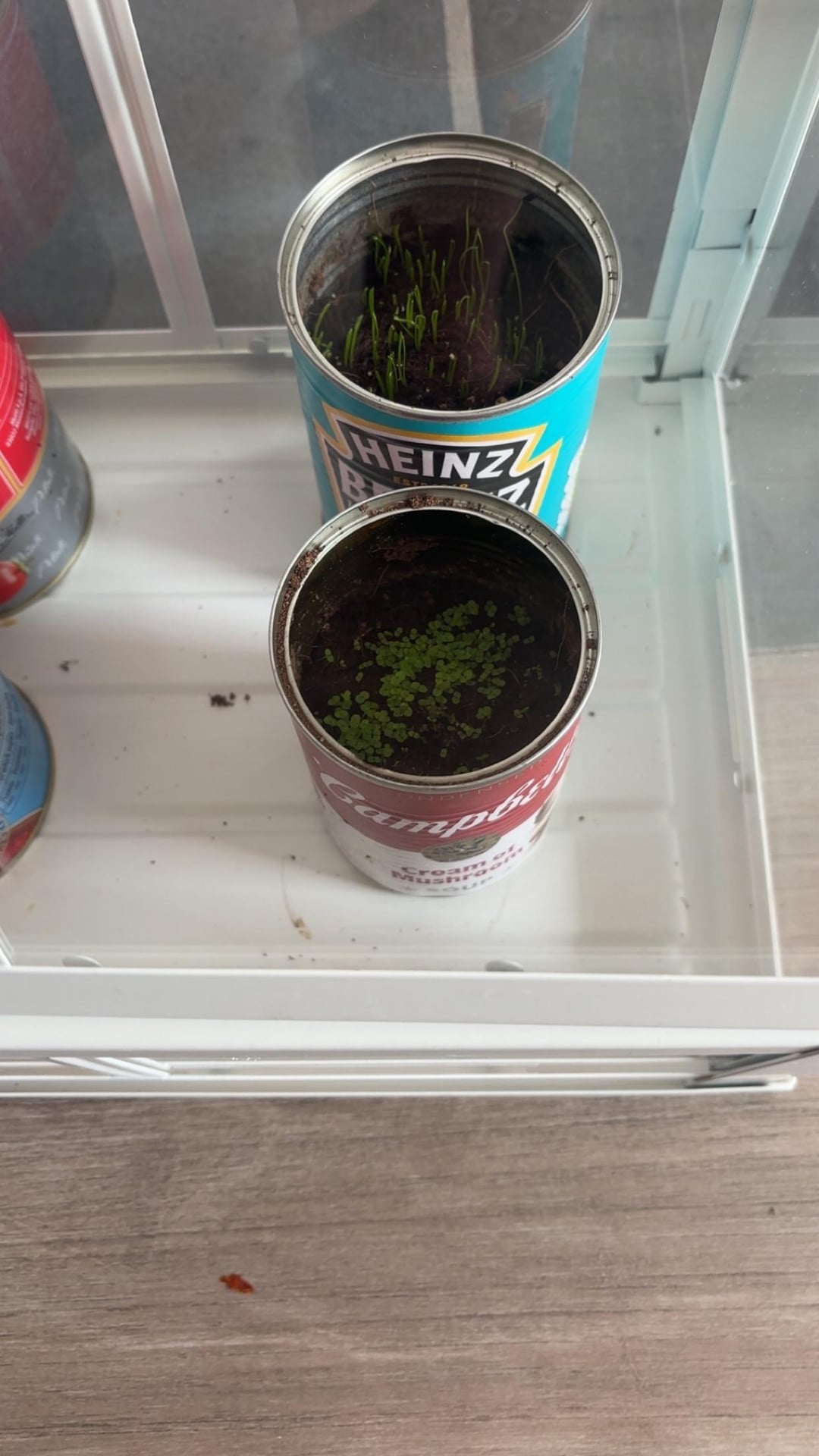 数週間前にこの小さな窓辺のハーブガーデンを始めて、今ではいくつかの生命が見え始めています。私が使用している窓辺はあまり光が入りませんが、うまく機能しているようです。今日は光を増やすために別の部屋に移動させました。ヒントはありますか? キャンベルスープ – オレガノ ハインツビーンズ – チャイブ