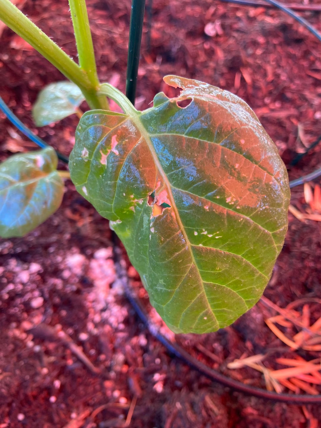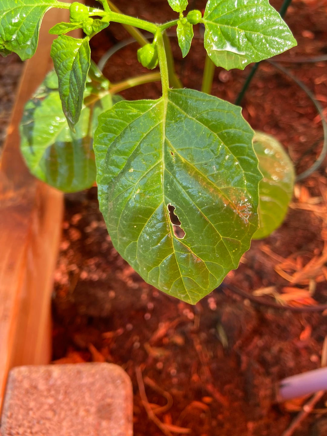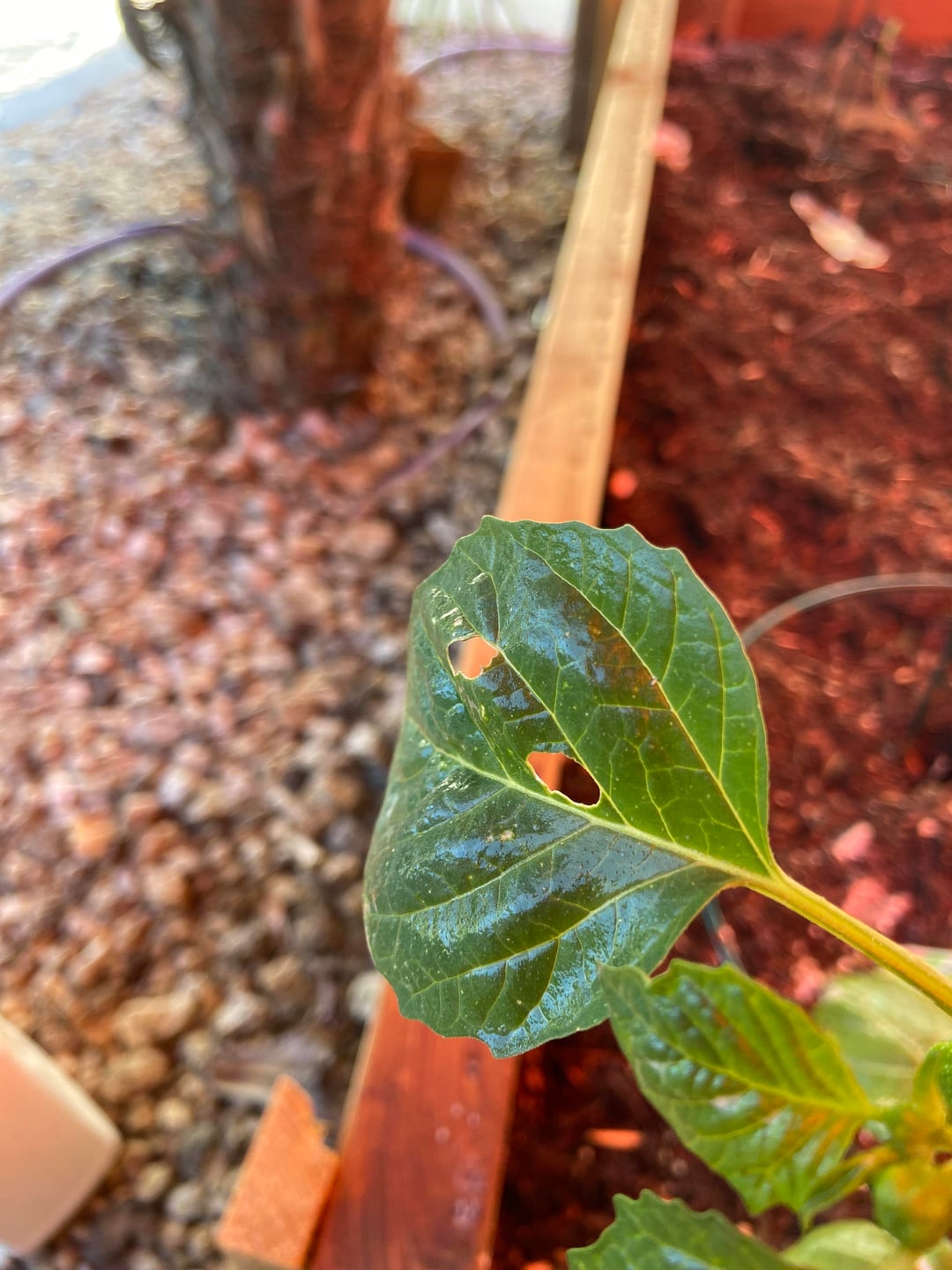 ノミハムシのように大きく見えます。これは何なのか、また感染症なのかどうかわかりますか?私は南カリフォルニアにいて、狂ったような太陽の熱波に間に合うようにシェードセイルを上げることができなかったので、白い斑点は日光による損傷である可能性があると思います。ニームオイルをスプレーし、DEを粉末にしました。今週の新ホールは1つだけ。