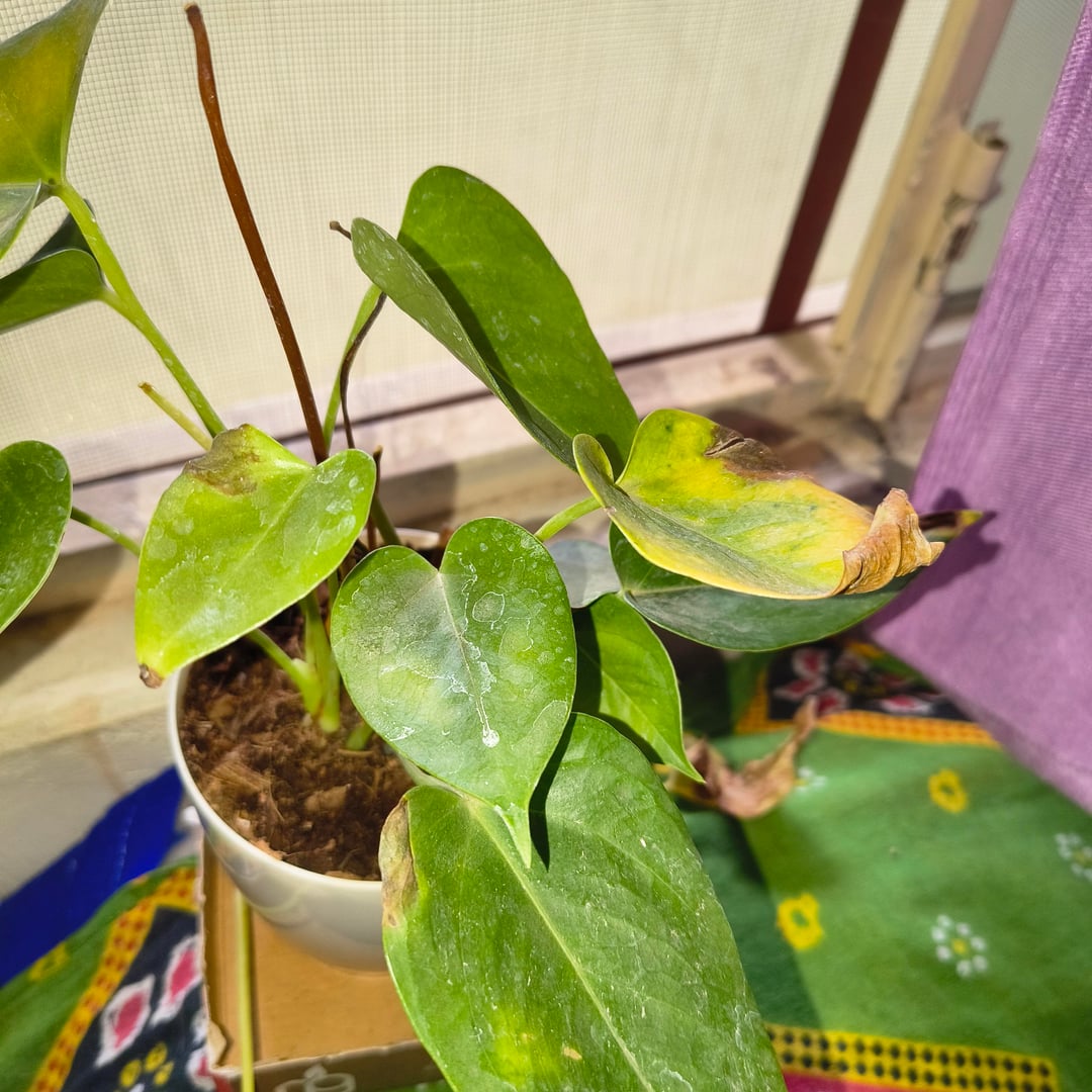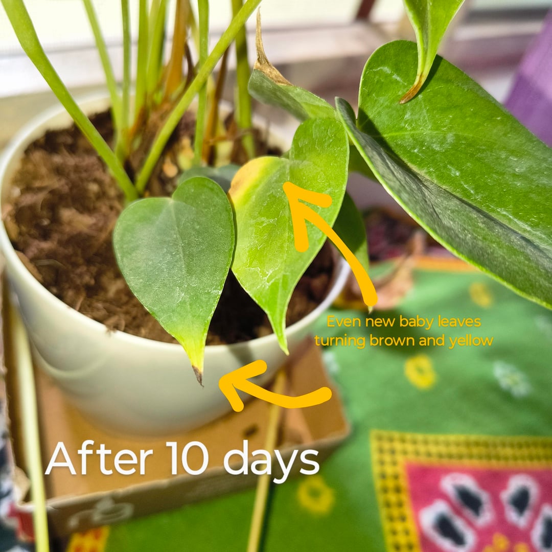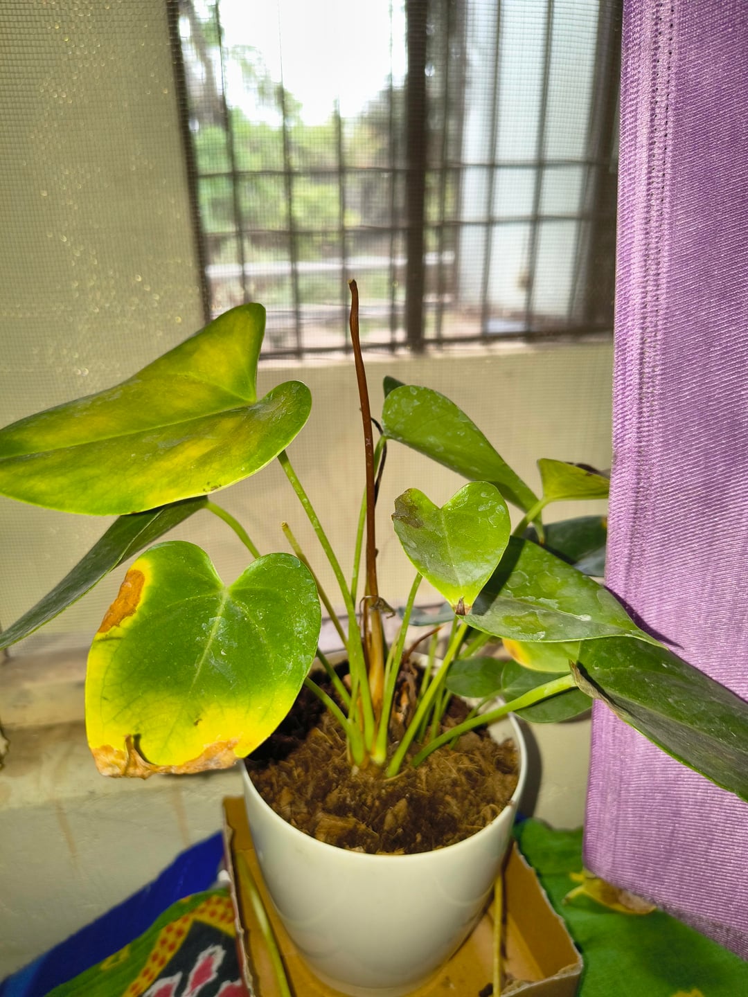 このアンスリウムを10日前にプレゼントでもらいました。初心者であまり知識がありません。最初は部屋の暗い場所に置いていました。1〜2日で葉が黄色くなり始めたので、日光の当たる小屋の場所に移動しましたが、数時間後に太陽が直接植物に当たったので、気づいた頃には大きな光沢のある葉が焼けて乾いていました。そこで、直射日光が当たらない窓の近くの部屋に戻しました(部屋にはファンが付いています) 24時間ON) しかし、その出来事から4〜5日経っても、何の改善も見られません 葉は乾いて黄色くなるだけです 新しい花も咲きません 新しい芽は先端が黄色か茶色に変わり、枯れます 水やりは、2〜3日おきにカップ半分の水やりをしています 指を土に突っ込んで、1〜2インチまで乾いたら水をやります 助けてください …植物を枯れさせたくない
