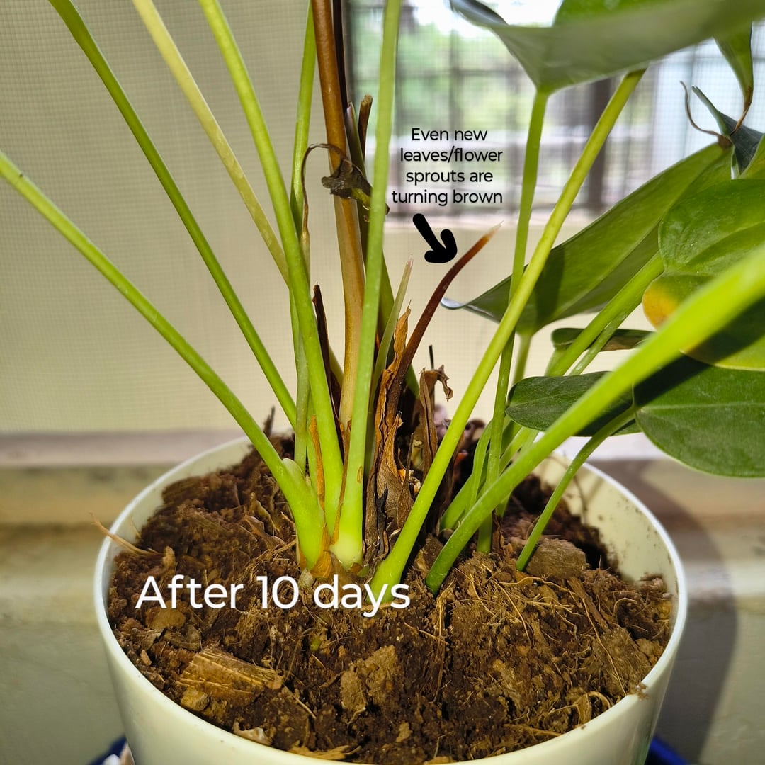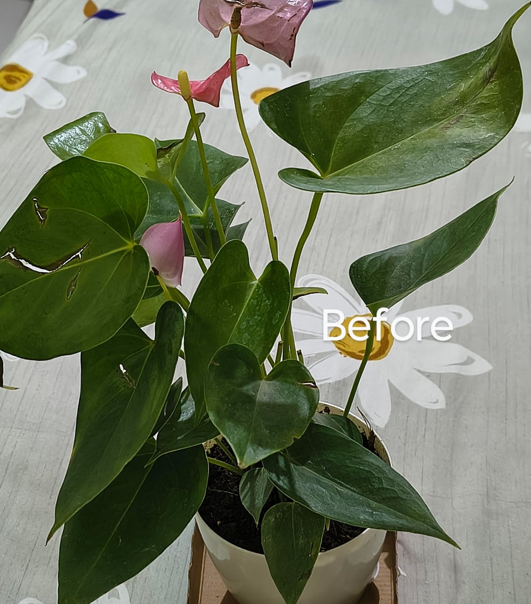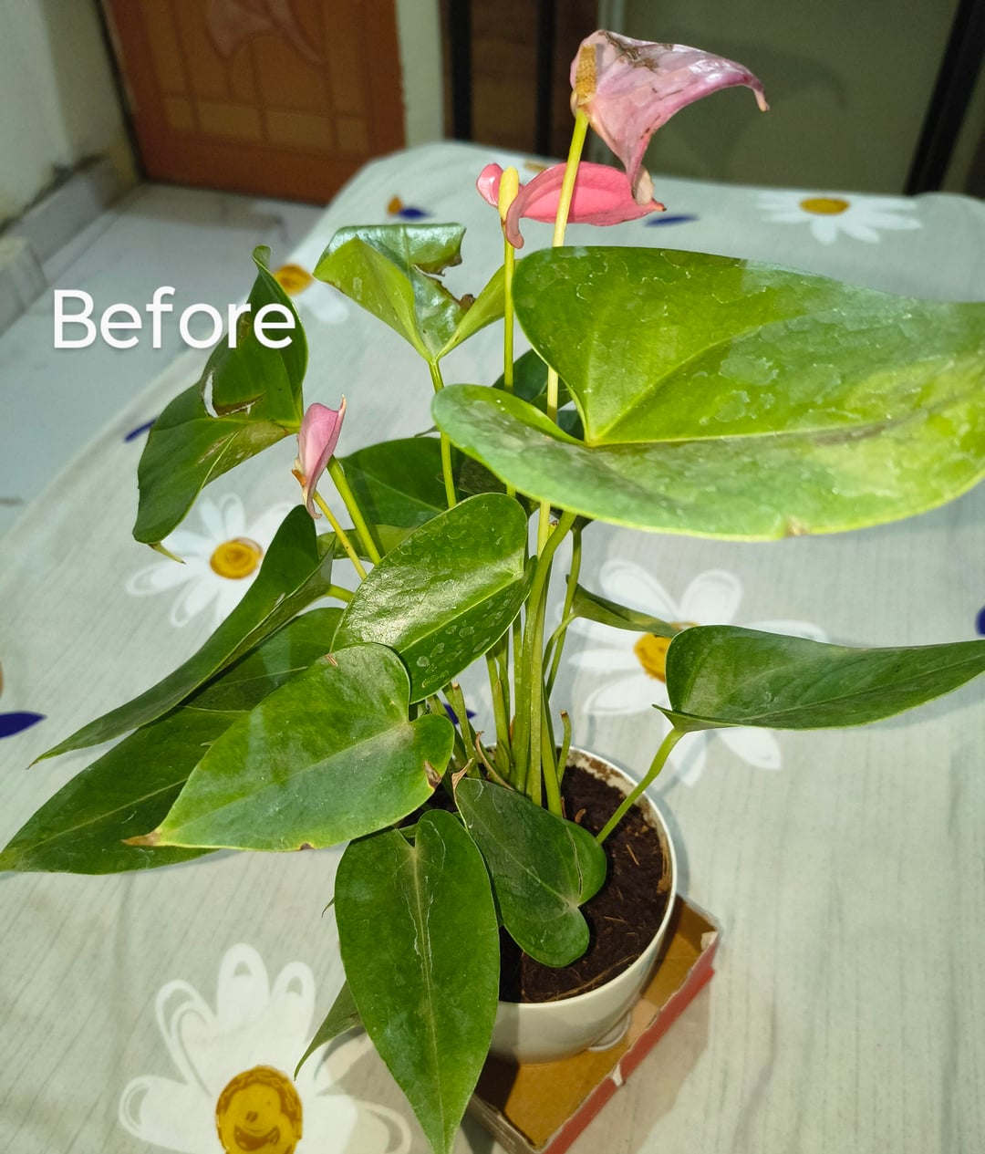 このアンスリウムを10日前にプレゼントでもらいました。初心者であまり知識がありません。最初は部屋の暗い場所に置いていました。1〜2日で葉が黄色くなり始めたので、日光の当たる小屋の場所に移動しましたが、数時間後に太陽が直接植物に当たったので、気づいた頃には大きな光沢のある葉が焼けて乾いていました。そこで、直射日光が当たらない窓の近くの部屋に戻しました(部屋にはファンが付いています) 24時間ON) しかし、その出来事から4〜5日経っても、何の改善も見られません 葉は乾いて黄色くなるだけです 新しい花も咲きません 新しい芽は先端が黄色か茶色に変わり、枯れます 水やりは、2〜3日おきにカップ半分の水やりをしています 指を土に突っ込んで、1〜2インチまで乾いたら水をやります 助けてください …植物を枯れさせたくない