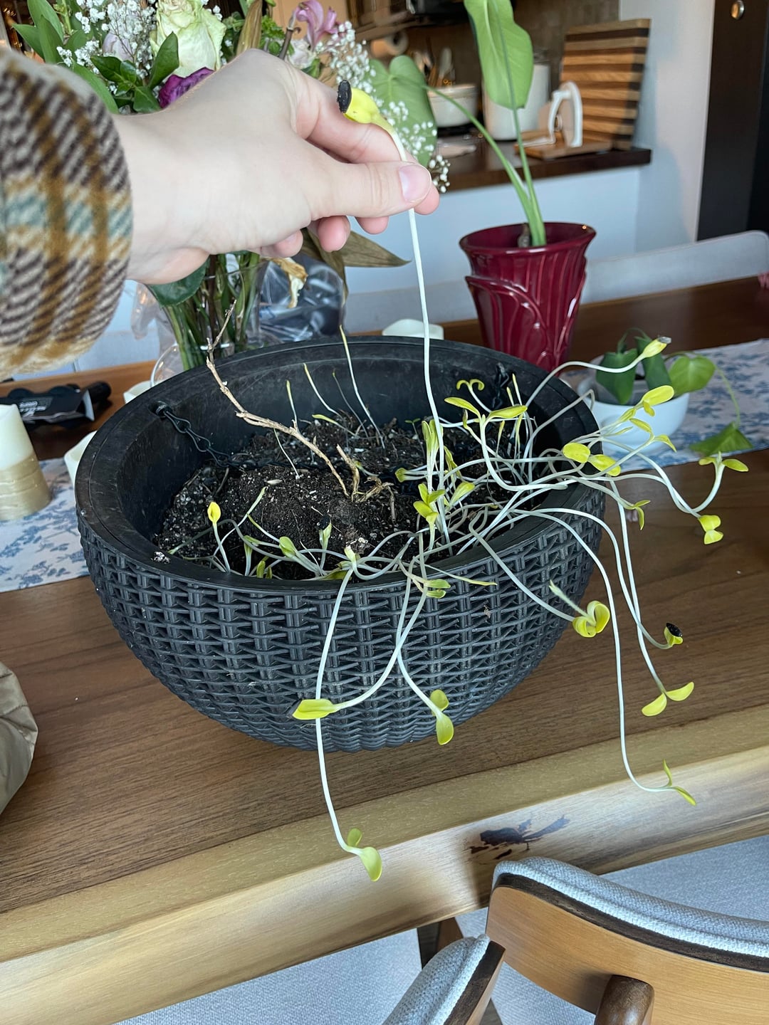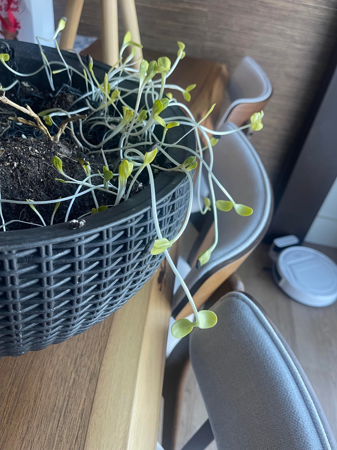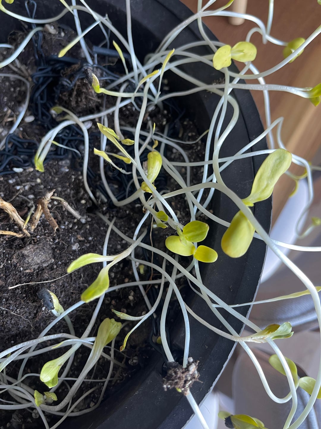 夏の間、私はこの吊り下げプランターを鳥の餌箱の近くに置いています。アカハネドリはヒマワリの種を嫌い、巣箱から種をすくい取るのが好きで、その一部がこのプランターに落ちてしまったようです。現在、デッキをやり直しているので、それが終わるまですべてをガレージに入れる必要がありました(約3週間前)。ガレージに出てみると、土が溶けた後、この非常に脚の長いヒマワリが発芽しているのが見えました(ゾーン5bにいます)。私が世話をして明るい場所に移動させれば、これらが繁栄する可能性はありますか、それとも雪が溶けたら放り投げるべきでしょうか??
