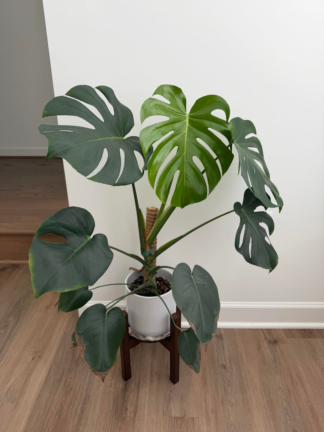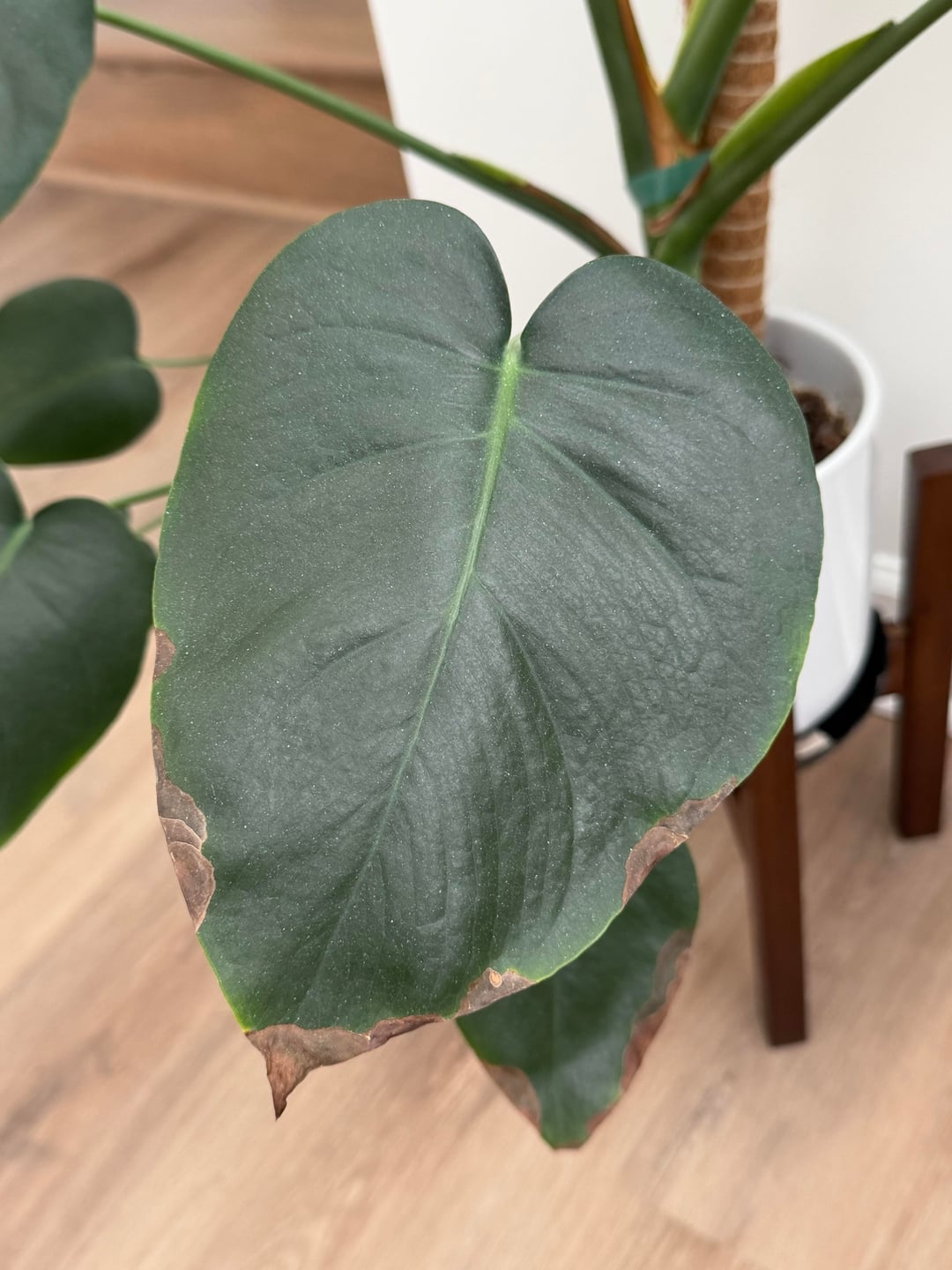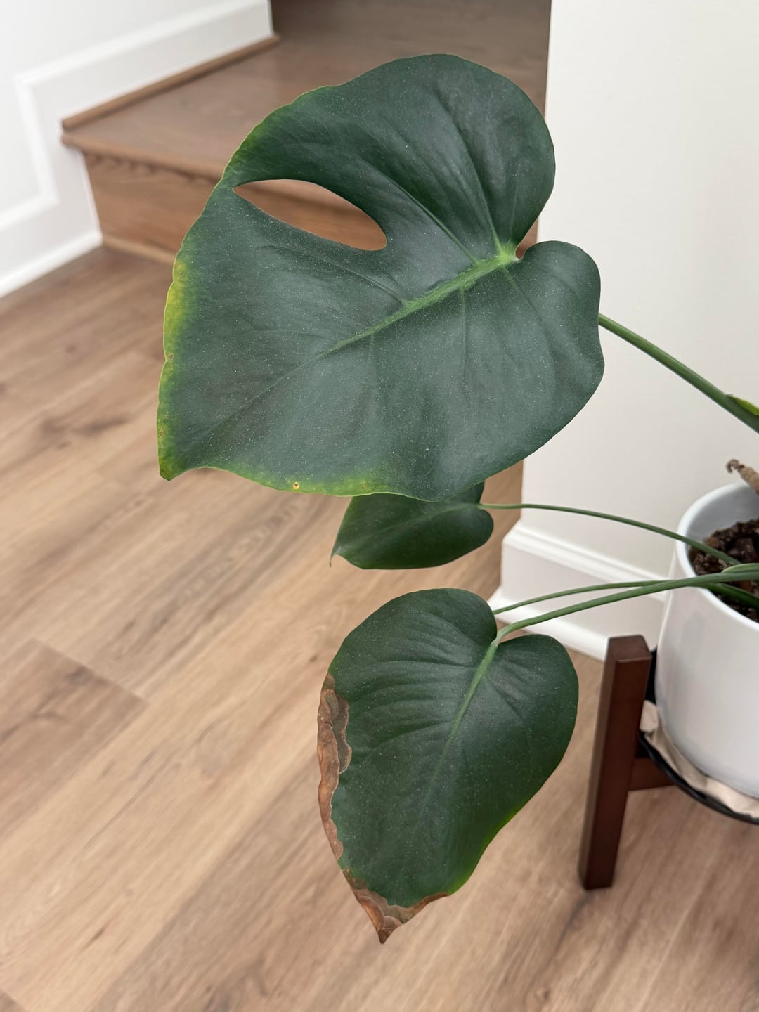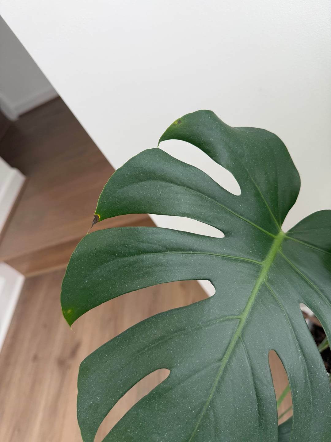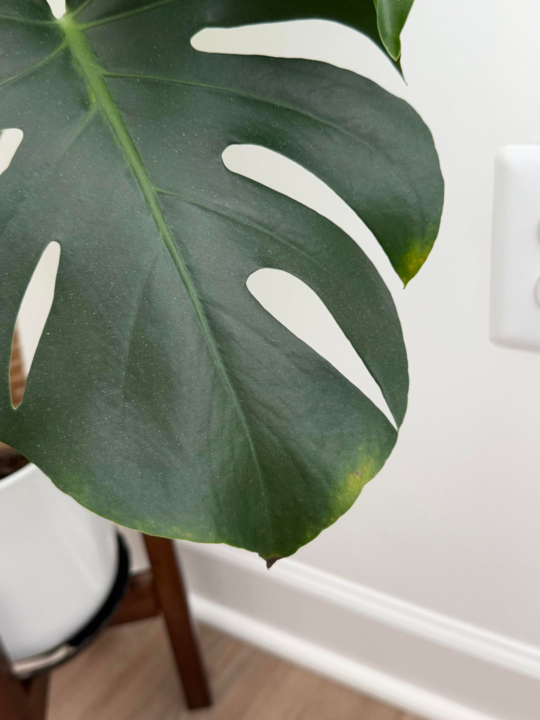 うちのモンステラの端がカリカリになったり、端に斑点ができたりしています😭 週に一度、排水穴から水が出るまで水やりをしています。東向きの窓にあります。直射光が当たるようにブラインドの角度を変えていますが、日差しが強すぎるのではないかと思っています。