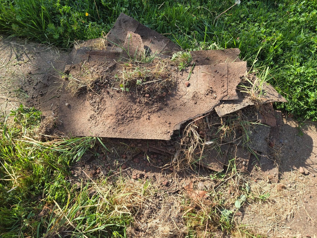 ガーデニングに最適な裏庭スペースがあったため、最近この物件に引っ越してきました。以前の所有者の一人が、ある時点で、余った屋根瓦(おそらくそれが瓦だと思います)を雑草抑制に使用することにしたことを知りました。劣化したプラスチックシートや景観布地を取り除こうとする庭師の悪夢を見てきましたが、これは私にとって新しいものです。