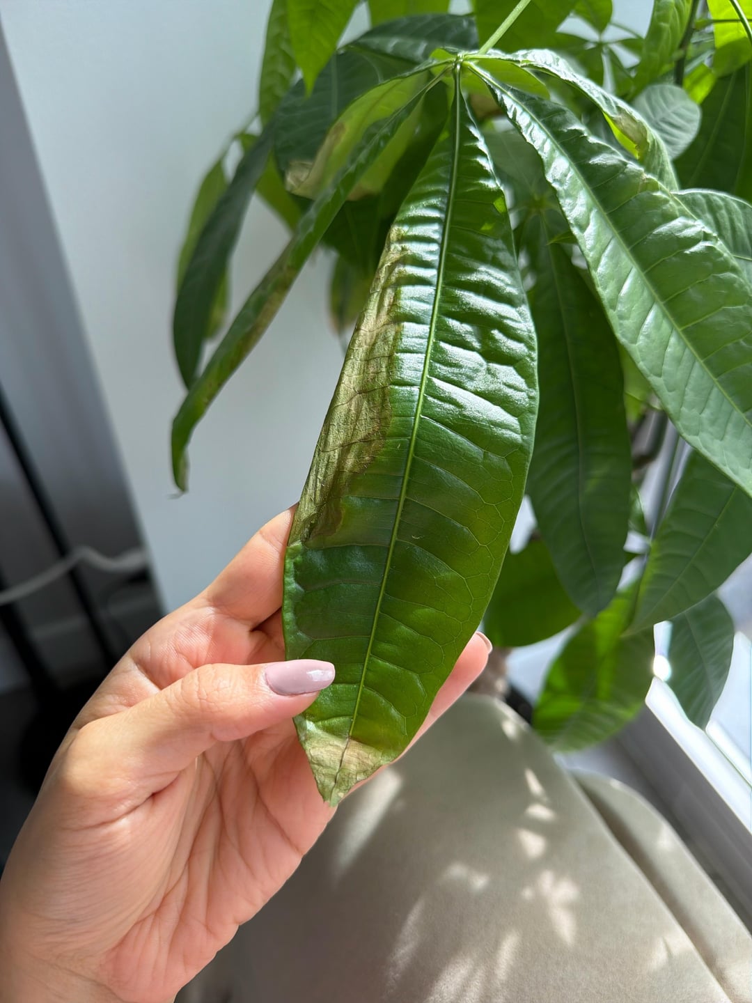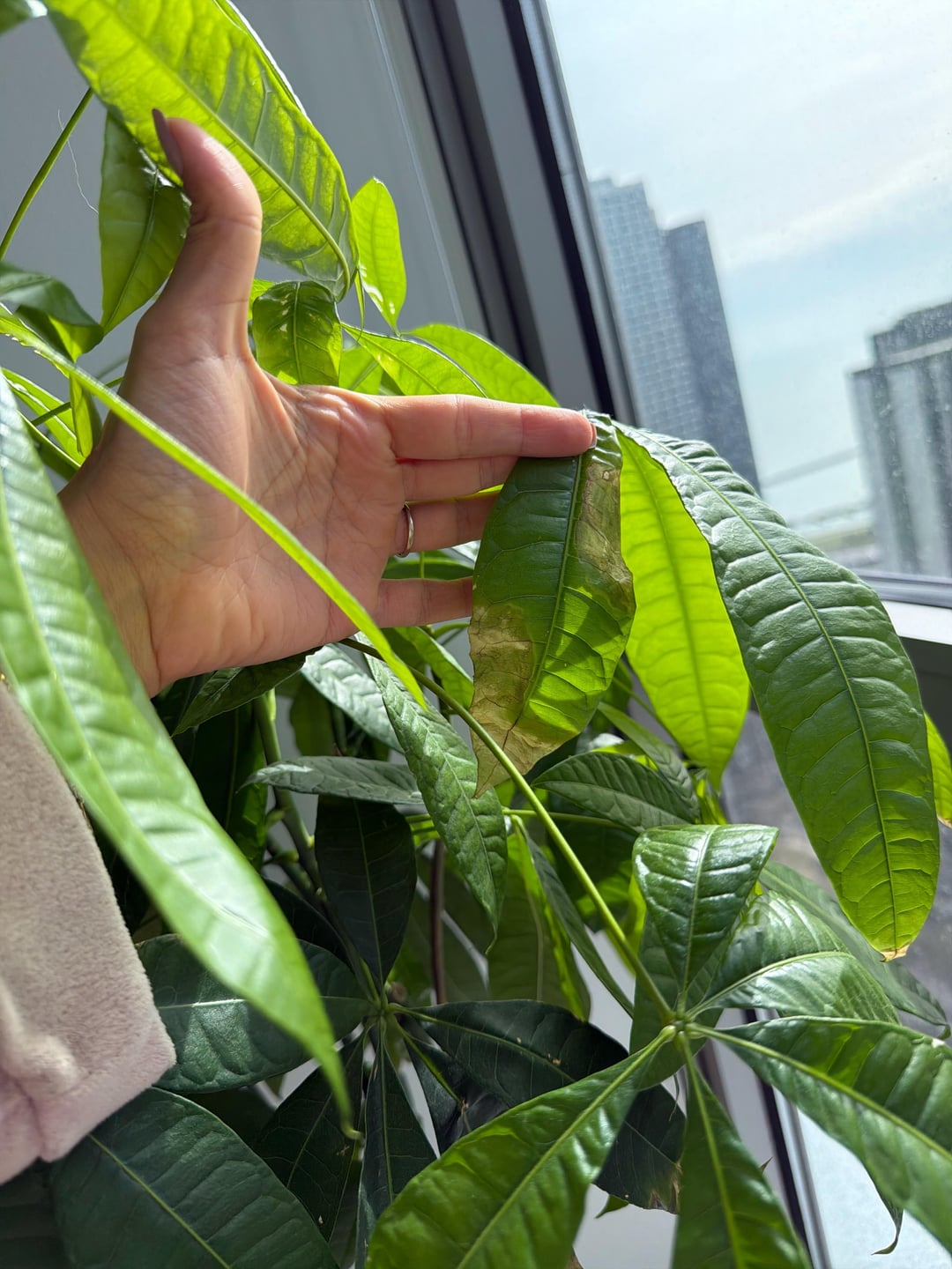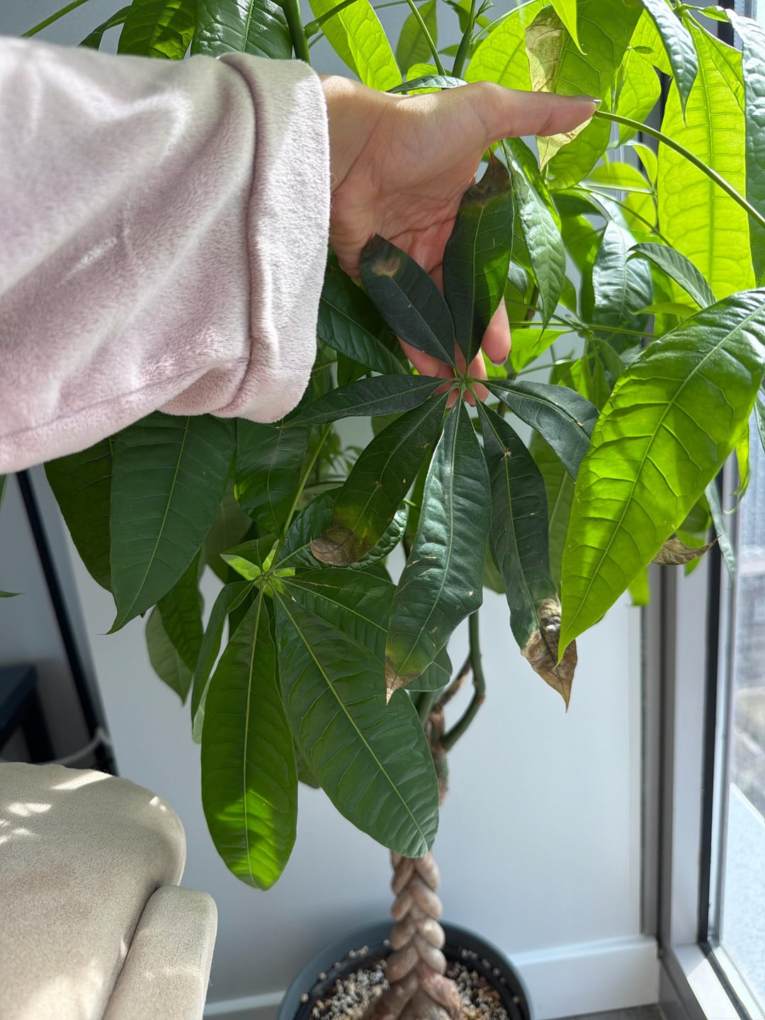 私の木が何を必要としているかを理解するのを手伝ってもらえますか? 😭 彼女の葉の多くはこのような状態ですが、これが乾燥の兆候なのか、それとも水のやりすぎの兆候なのかわかりません。植物は南向きの窓の近くにあります。