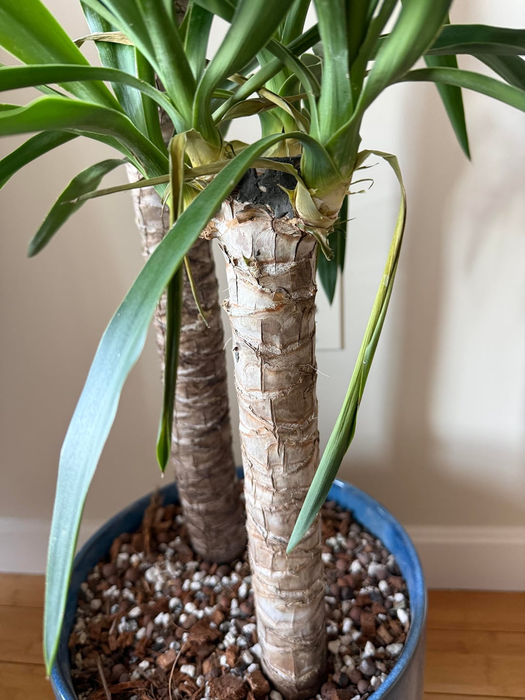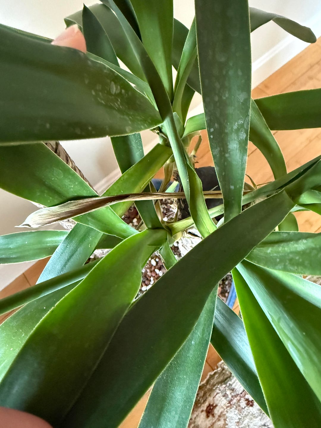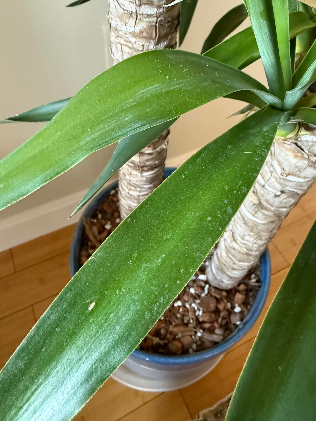 この植物はもともと西向きの窓にありましたが、その後約7フィート離れた場所に移動しました。まだ一日中非常に明るい間接光があり、多少の直接光もありますが、以前ほどではありません。ふわふわの土のような多肉植物の土に、ソルソイル多肉植物グリッティミックスを混ぜて使いました。隔週で水やりをしているのですが、葉が枯れて丸まり、シャキシャキした感じになり、黄色から茶色になりつつあります。これまで植物に害虫がついたことがなく、何を調べればよいのかわかりません。葉には、乾いた水の斑点のように見えるほこりっぽい斑点がいくつかあります(単にほこりを払う必要があるかどうかはわかりませんが、乾いたマイクロファイバータオルで拭き取ると、消えたように見えますが、1時間ほど後に消えます)。背の高い植物よりも小さな植物の方がこの問題に悩まされているようです。ユッカの葉が硬化/乾燥してカリカリ/茶色になるという明確な症状はありますか、それともこれは理解するためにさまざまなことを試す必要があるものの1つですか?アドバイスをいただければ幸いです。