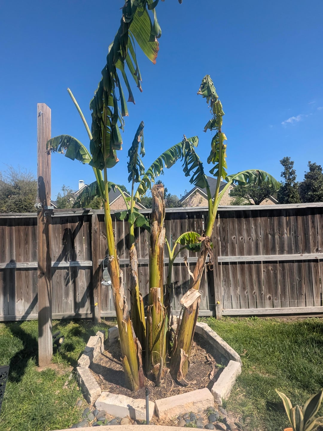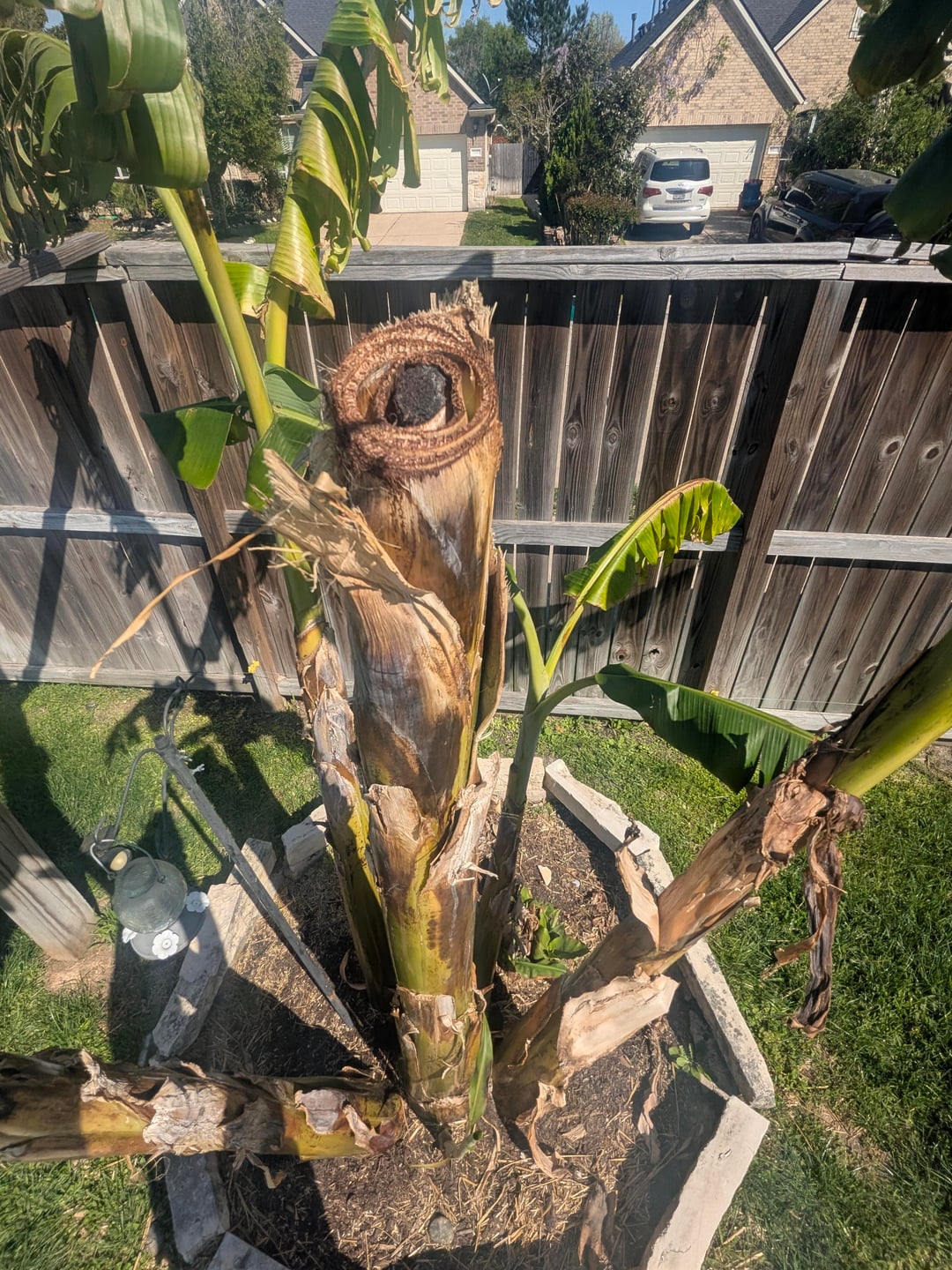 バナナの木: そうですね、最初に言っておきますが、私はグリーンサムではありません。 😂。どういうわけか、私は数年前にこの木を2フィートの在庫(ホームセンター)からなんとか入手してこれにしました。小さなバナナもたくさん入っていましたが、最近のヒューストンの凍結を乗り越えることができないと思われたので、カットしました。わかってる、わかってる…まだ初心者です。私の質問は、すべての茎が葉を出して幸せそうに見えますが、メインの茎はそれほどではないということです。ご提案をお待ちしております。