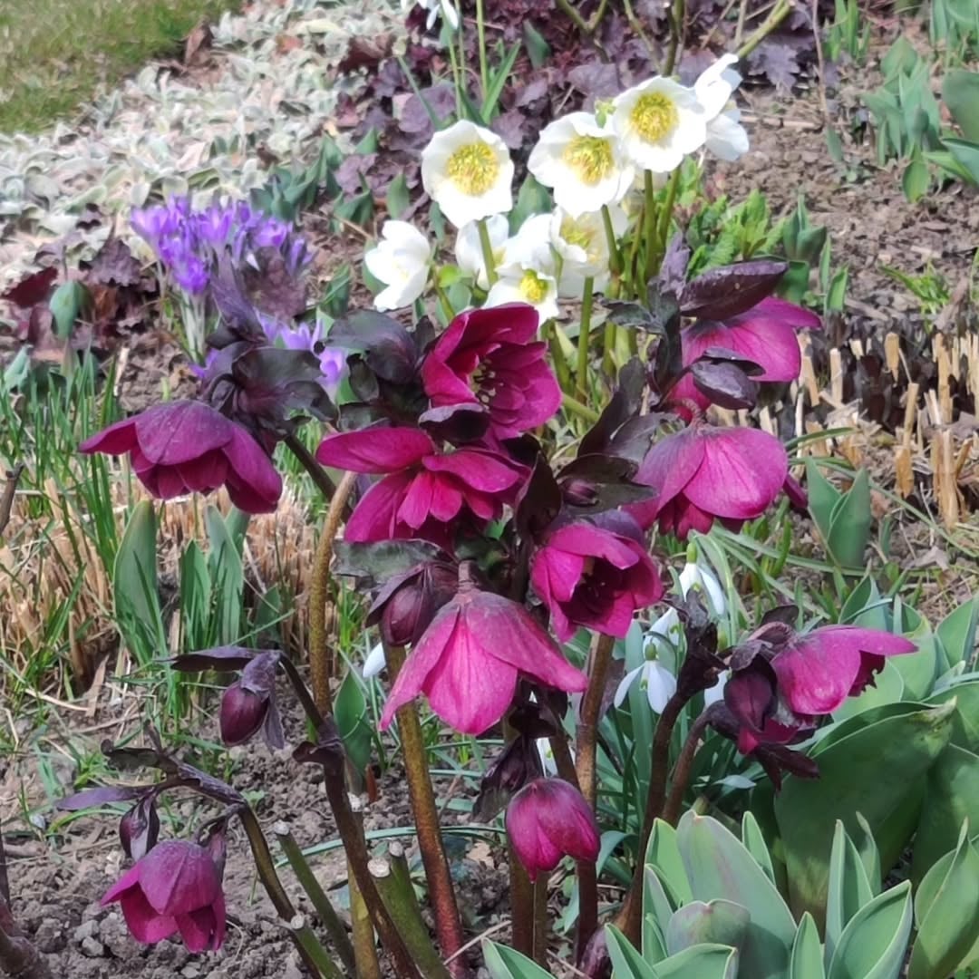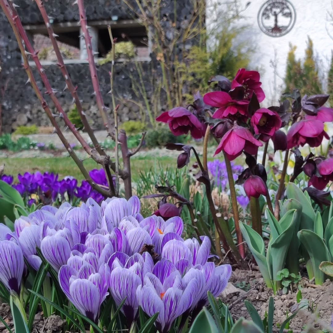 クロッカス・ベルナス「キング・オブ・ザ・ストライプド」とレンズ豆のバラがベッドに色を添えています。