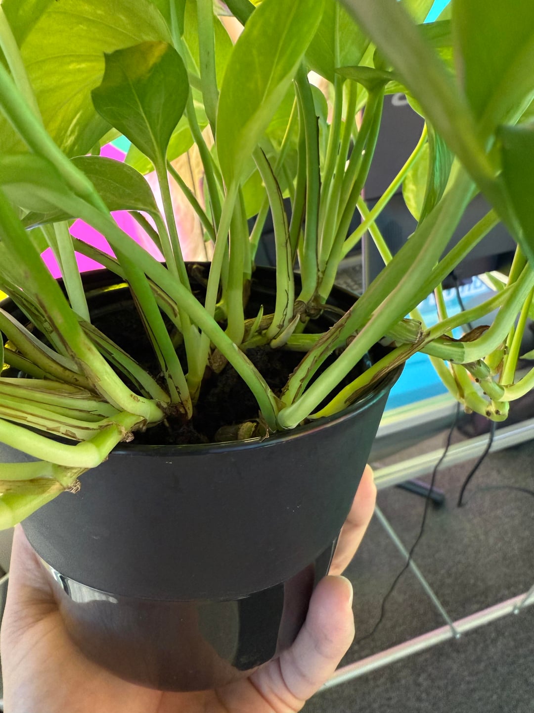 それで、数か月前、上司の妻が、上司の仕事がうまくいっていないから、彼女の植物の世話をするように私に言いました。前の写真があれば良かったのですが、彼女の様子は悪かったです。リクエストがあった週末に彼女を家に連れて帰り、ポジティブなエネルギーを得るためにバルコニーにある植物の隣に置きました。それ以来、彼女はオフィスにいて、とてもうまくやっています。雨が降ったときは、外で雨水を与えて愛情を注ぎ続けます。彼女は健康のようで、新しい赤ちゃんも生まれています。すぐにもっと大きな鉢が必要になると思いますか?そして、誰かが彼女の茎の茶色くなっているものを教えてもらえますか?お願いします!ありがとう!何か提案があれば教えてください。