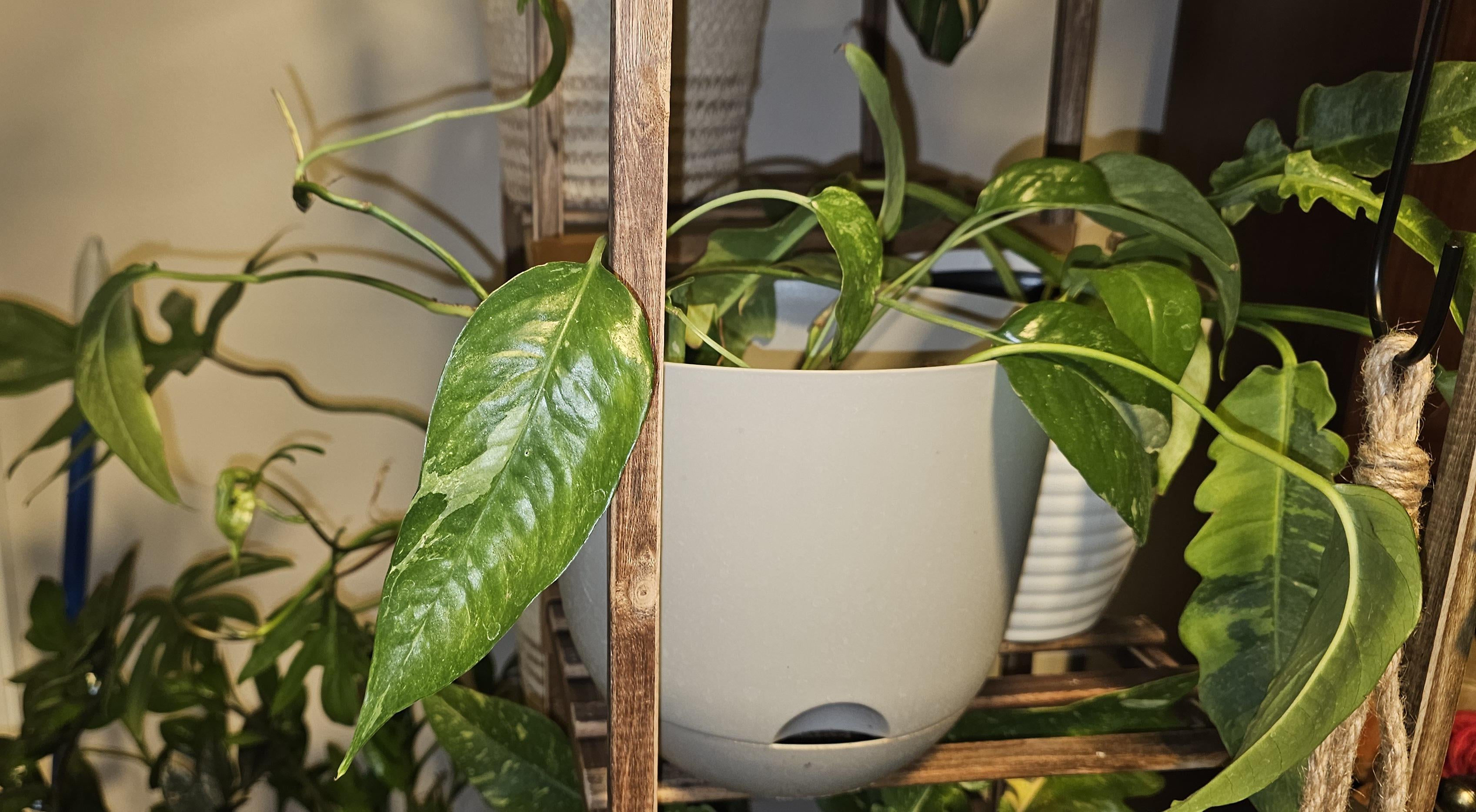 私のエピプレナム アルボ ヴァリエガタは、長い年月を経て、白がほとんどなくなり、小さな斑点だけが残り、半分が緑色に戻ってきましたが、ようやく少しかわいく見え始めました。