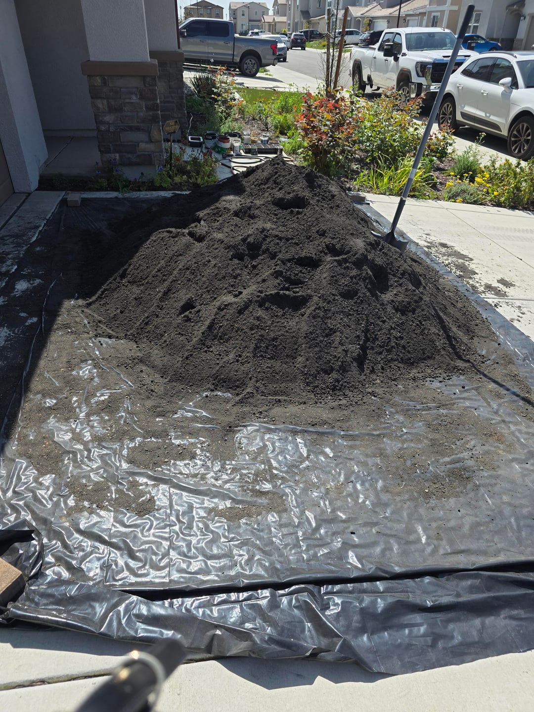 参考までに、手押し車はオプションではありません。上げ床の間のかなり狭いスペースを通過し、バケツを持って横向きにならなければならない場所まで、12" 空間の。残念ながらバケツでなければなりません。背中ではなく足で持ち上げることで怪我を避けることができ、ガーデニング用の手袋のおかげで手も楽に保てています。私 (36 階) にはヘルパーはいませんが、素晴らしい運動ができていることは間違いありません。この山が自分の額の汗で縮み、庭の花壇に栄養を与えていくのを見るのは実際楽しいです。いいえ、私は HOA を持っていません。ここ北カリフォルニアではすでに暑くて乾燥しているため、この山にとって唯一の潜在的な敵は風です。幸いなことに今のところ風はありません。これは半分が腐植質で半分が堆肥ですが、特に小さな木片のようなものでできている地面の庭の土のミラクルグロと比較すると、私にはほとんど砂のように見えます。レイズドベッドに植えた花がどのように育つのか興味があります。