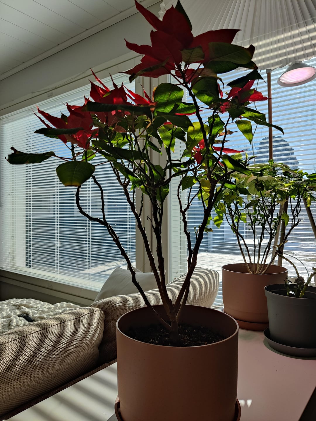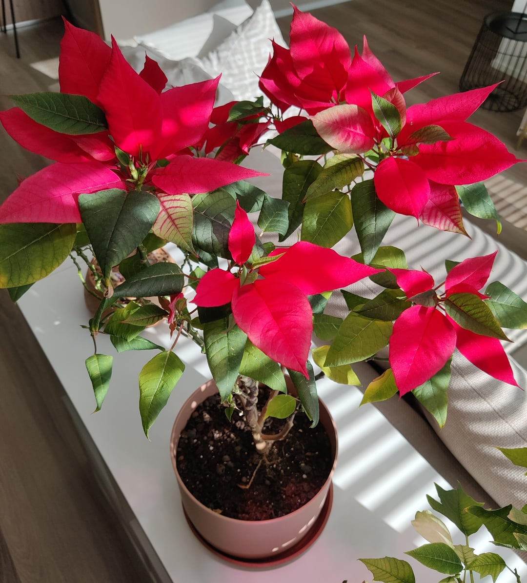 2歳のポインセチアは背も高く、脚も伸びてきているので、もっとふさふさになるように促したいと思っています。しかし、正確にどこをカットすればよいのかわからないので、助けていただければ幸いです。