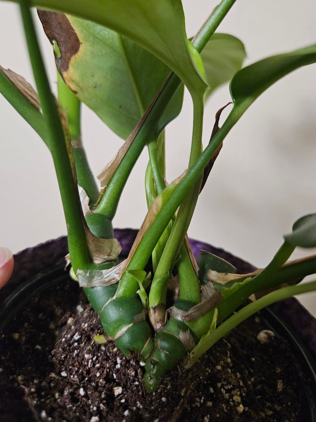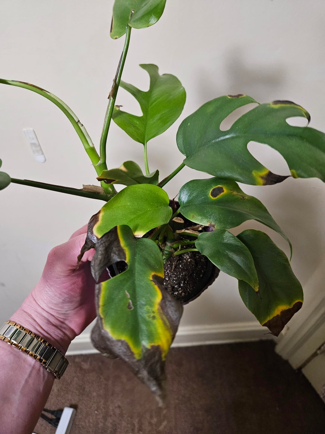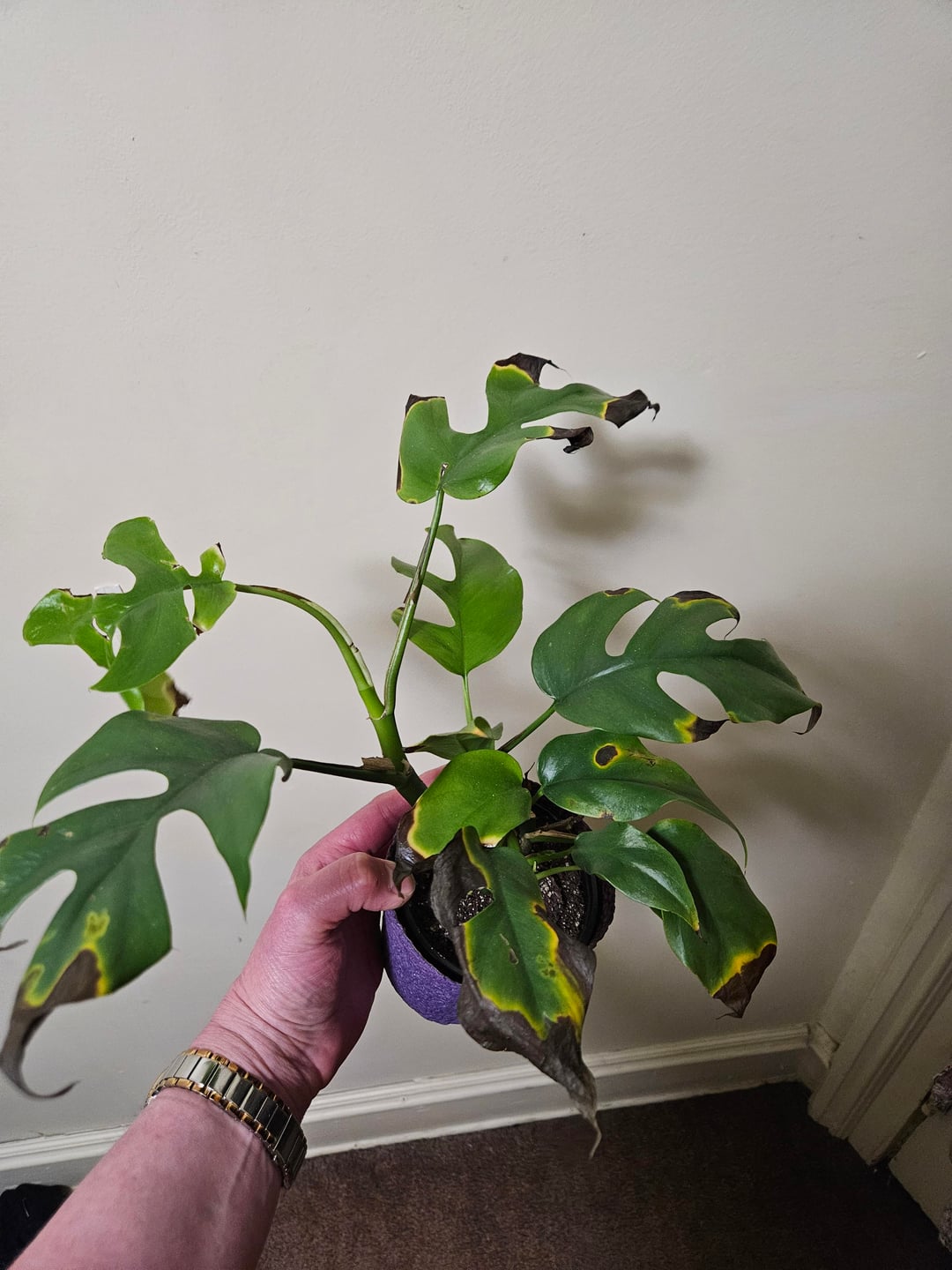 植物を販売するビジネスをまったく行っていない地元の小さなスーパーマーケットでこれを購入(救出し)しました。水やりが多すぎたように見えますか?茶色になった葉は切り取ったほうがいいでしょうか?少し乾燥させて、移植する前に調整するのを待っています。新たな成長も見られるので、とても楽しみです。私の新しい友達は料理できましたか? 😢