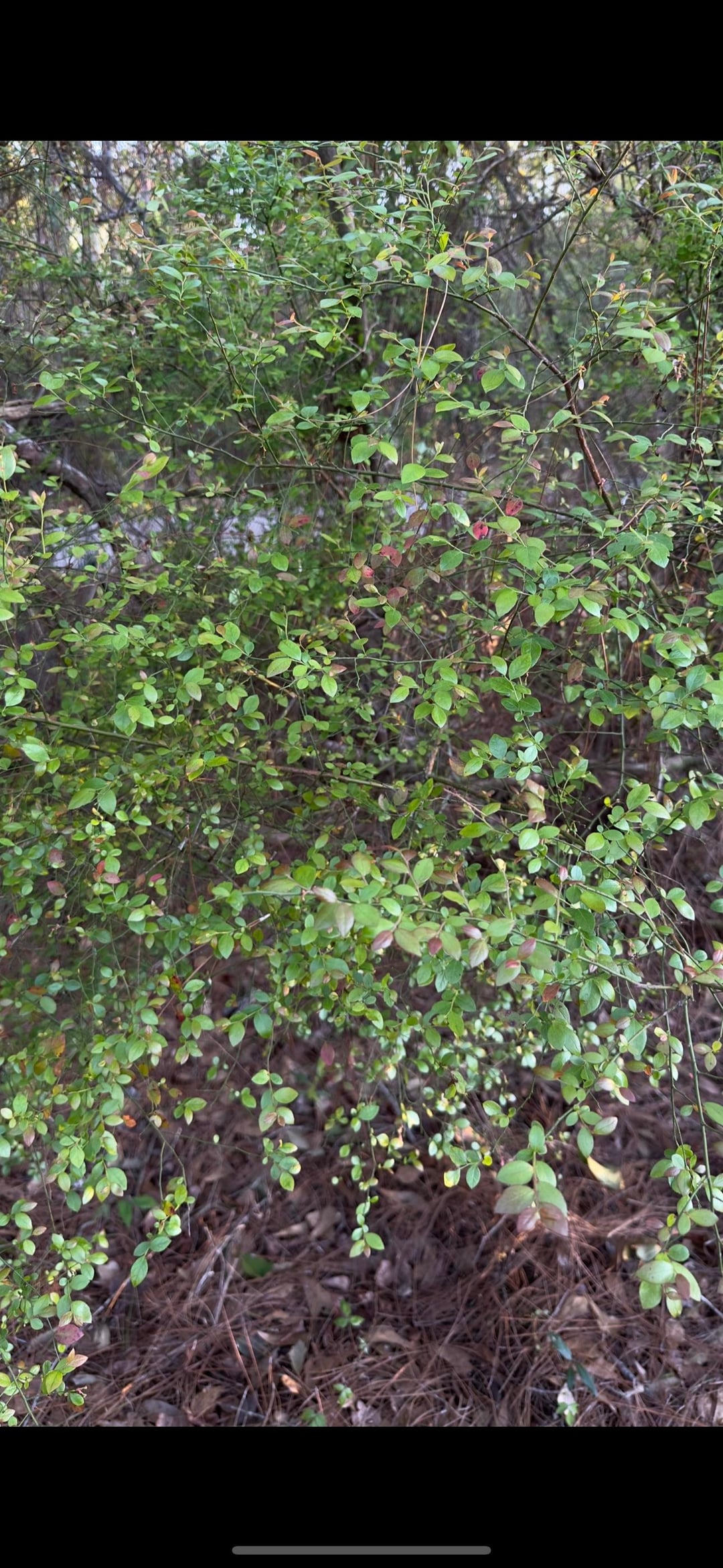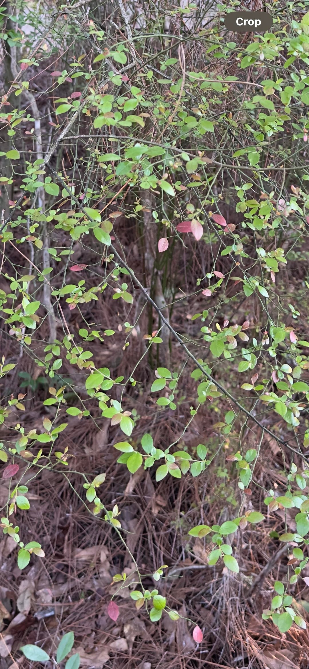 ほとんどの葉はしっかりした緑色ですが、かなりの葉が赤または赤みを帯びています(写真の丸で囲った例を参照)。それは複数の茎を持つ茂み/低木のように機能します – 低い枝が地面に触れて根を張り、新しい植物を開始します(層状/繁殖スタイル)。いくつかの場所では、それはより短く/よりふさふさしたままですが、庭の他のエリアでは、高さ8フィートを超えています。