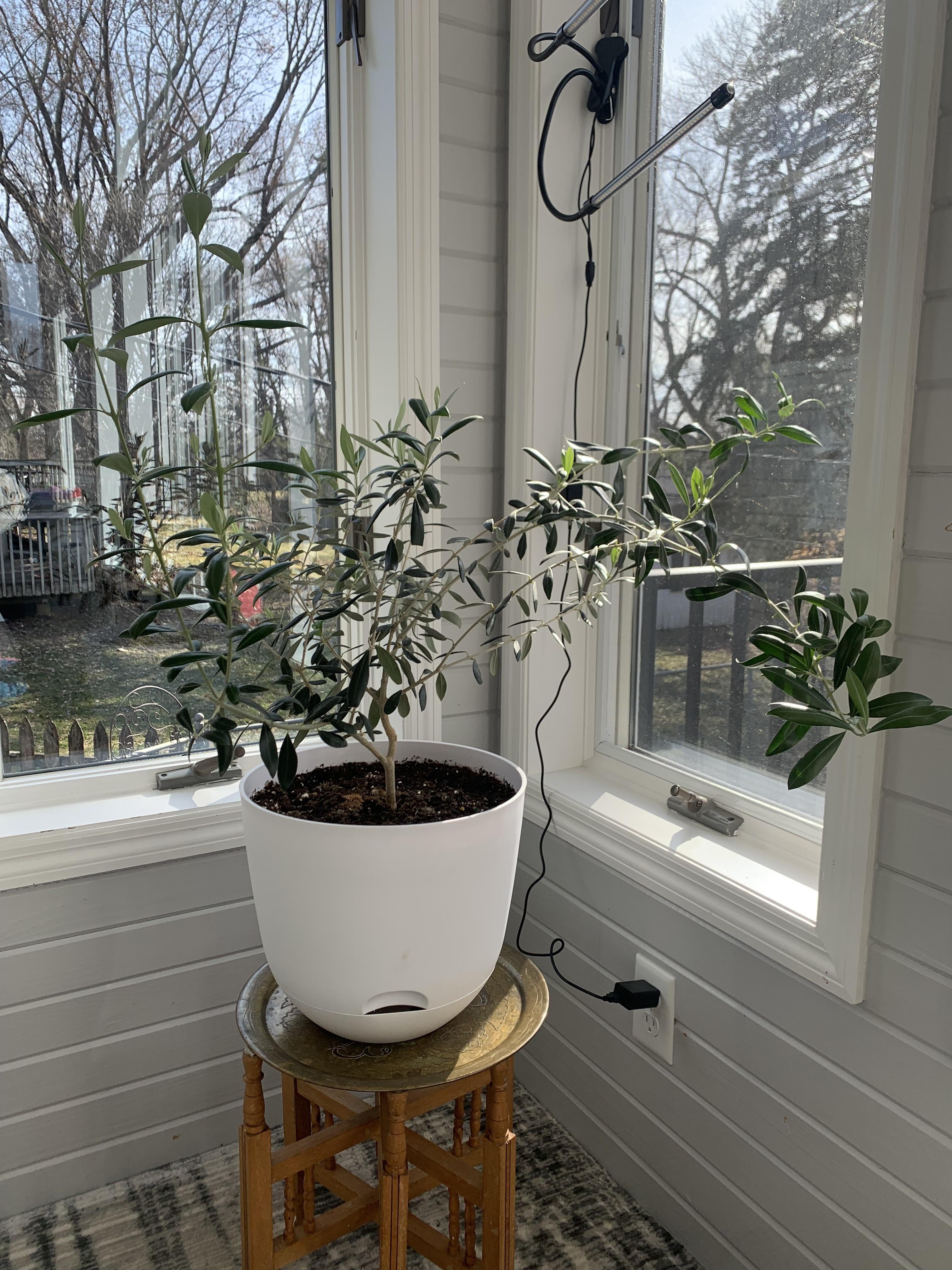 なぜこのオリーブの木がこれほど不均一に成長しているのか、心当たりはありますか?私はそれを動かして、すべての面に光が当たるようにします(自然光と成長光)。ヒントは大歓迎です、私はこの男が繁栄することを願っています。