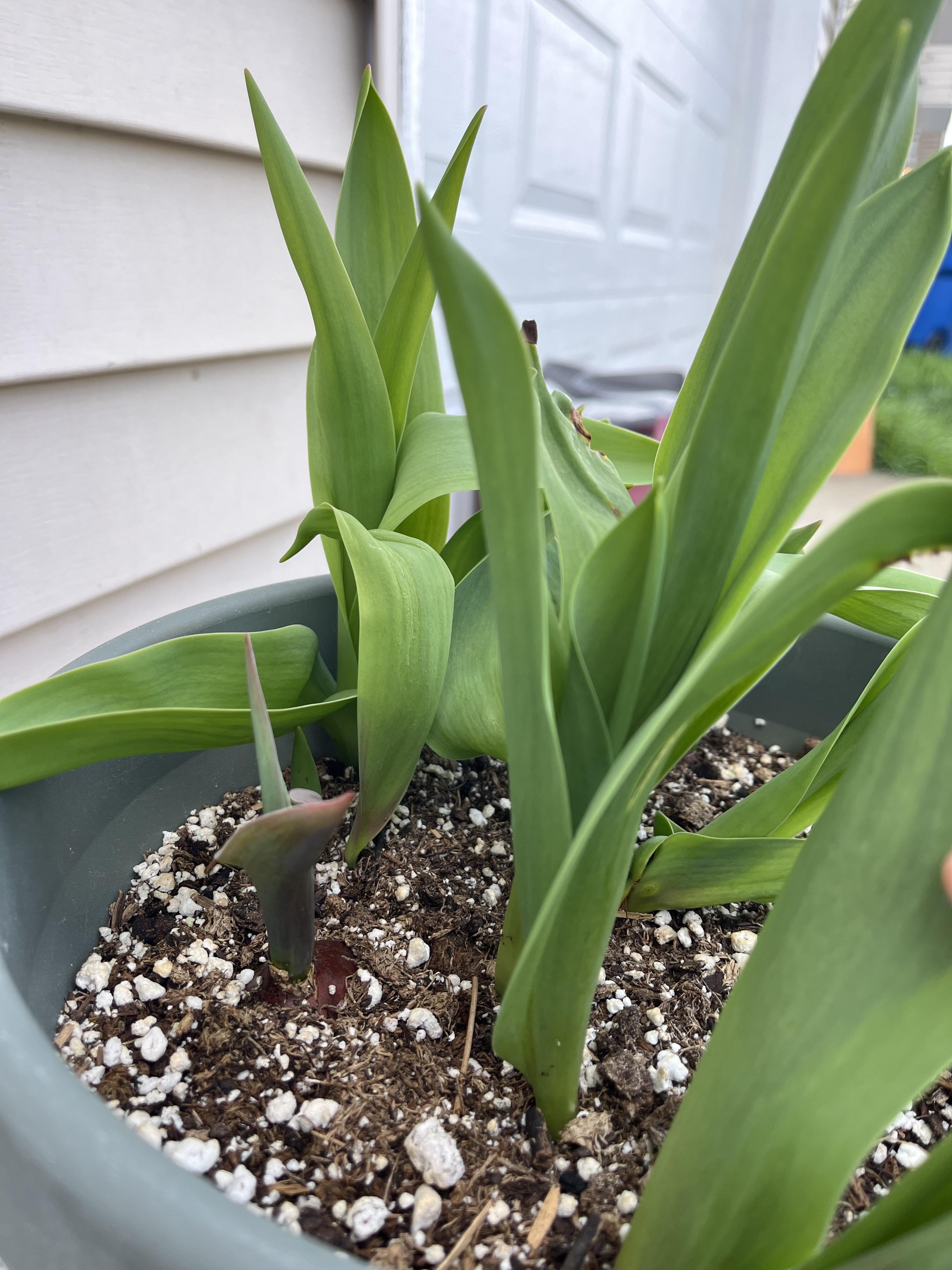 チューリップの球根を植えたので大きくなりました。でも、手前のものはもっと小さくて紫色です – 枯れかけているのでしょうか?チャンスを増やすために植え替えたほうがいいでしょうか?ほとんどの日は5時間以上太陽が当たり、水は雨から得ます。