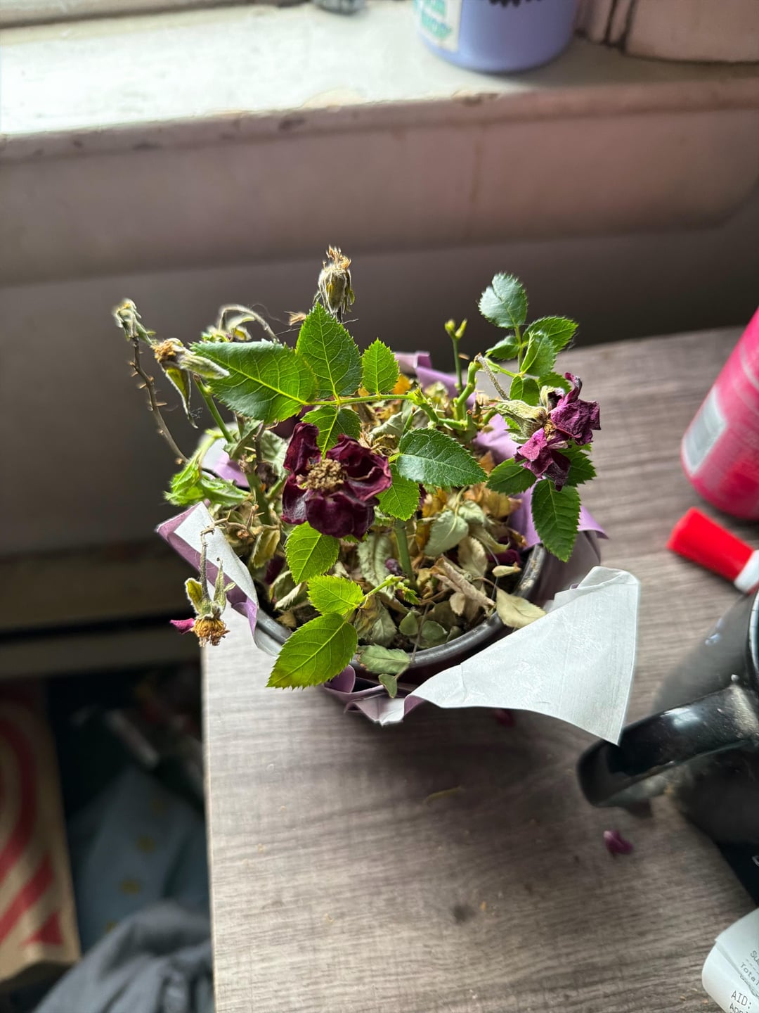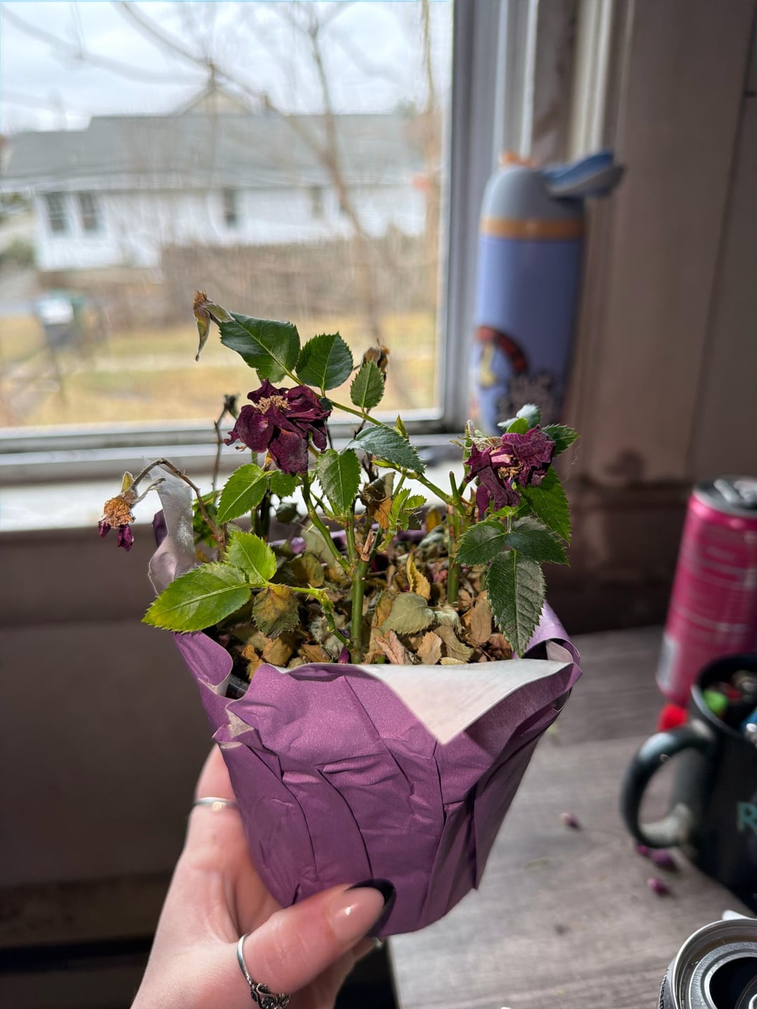 ちょっと、そこ!!バレンタインデーに生徒の一人からこのミニバラ(ブッシュ?)をもらいました。元気に育っており、元気に見えましたが、今月初めに休暇に行ったので、家のシッターはそれを見ずに水やりをしなかったに違いありません:( 復活できるのか?それともゴミ箱に行く運命なのでしょうか?