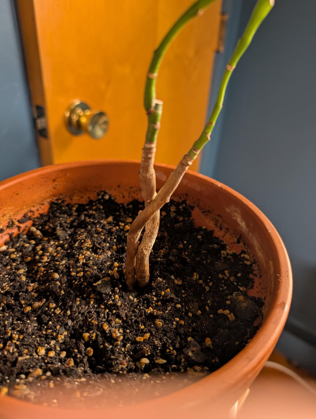 いろいろ調べた結果、水はけの良い別の土に植えるか、浅めの鉢に植えるか、迷っています。あるいは、単に新しい家に慣れる必要があるだけかもしれません。それとも、チョップして支柱を立てて最初からやり直す必要があるかもしれません。