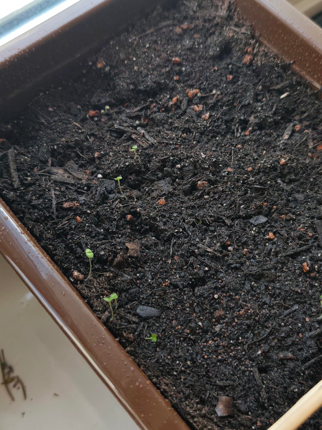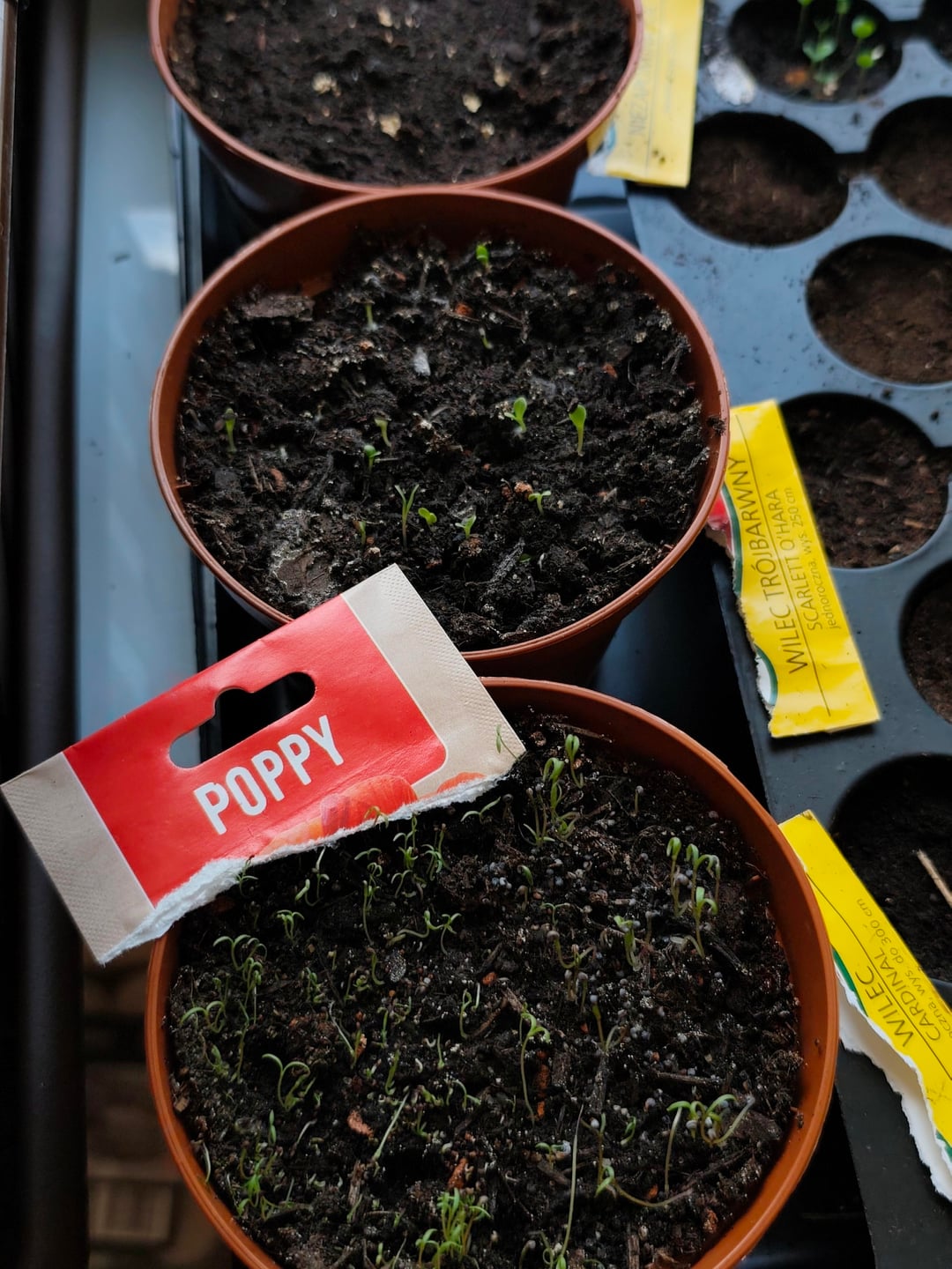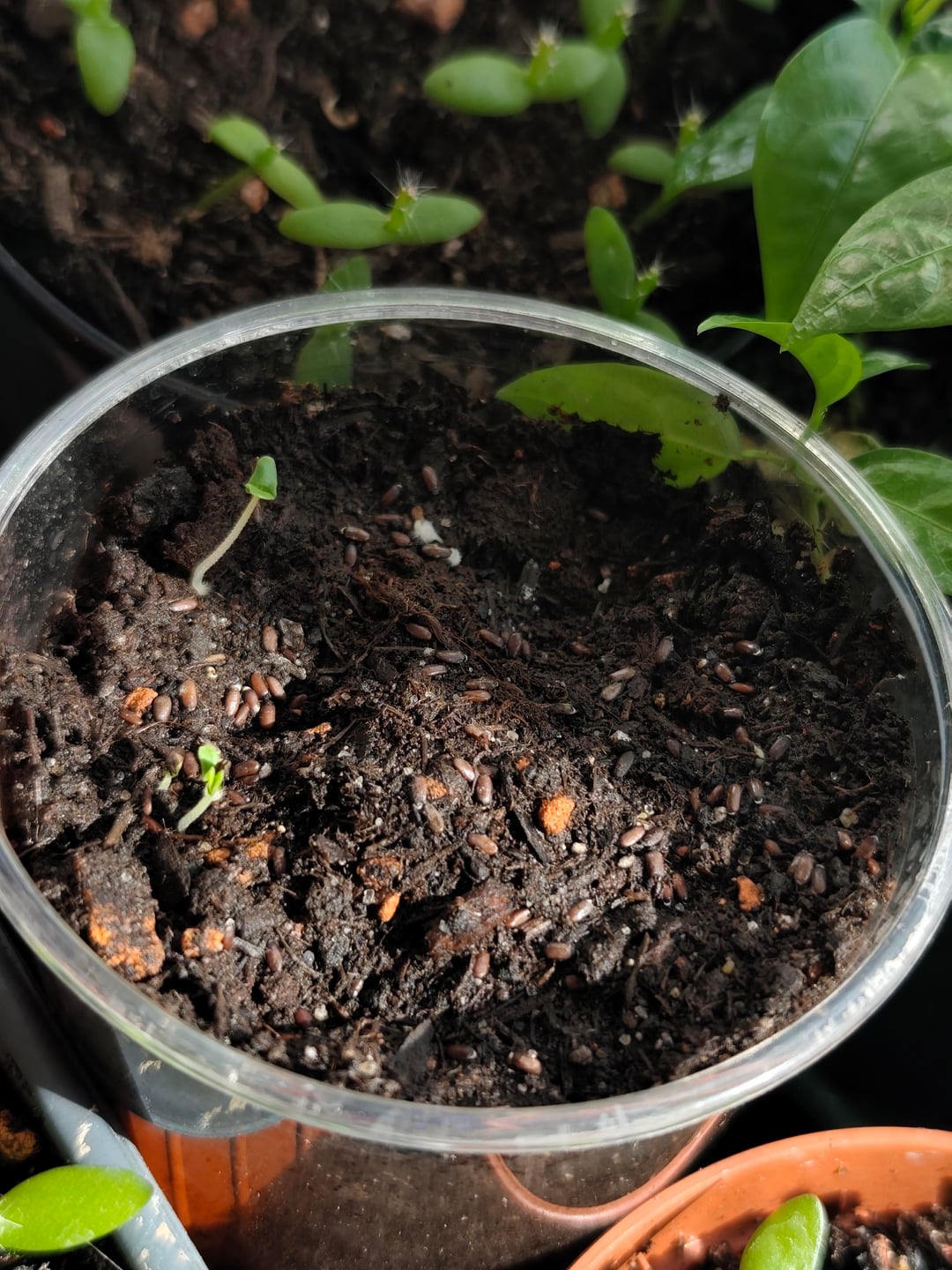 こちらが私の赤ちゃん達です✨ パッションフルーツ、ピタヤ、ラベンダー、スイバ、チャイブ、タイム、アスター、ポピー、アサガオ(2種)、ワスレナグサ ローズマリー、ラビッジ、カルパティア桔梗、レモンバームはまだ発芽していません 1週間半前に種を蒔きました ピタヤとパッションフルーツ以外は11月から来ています