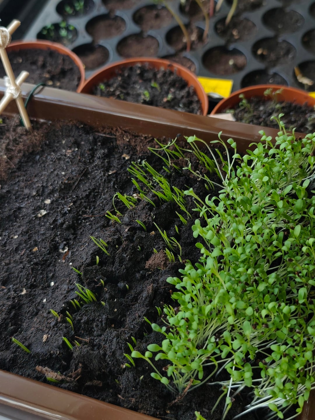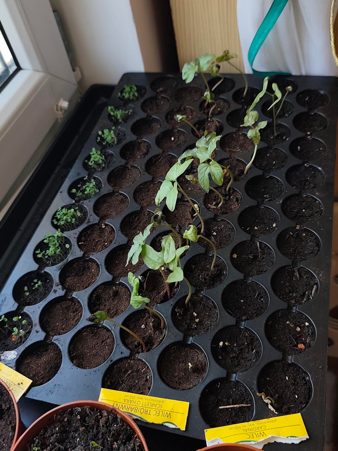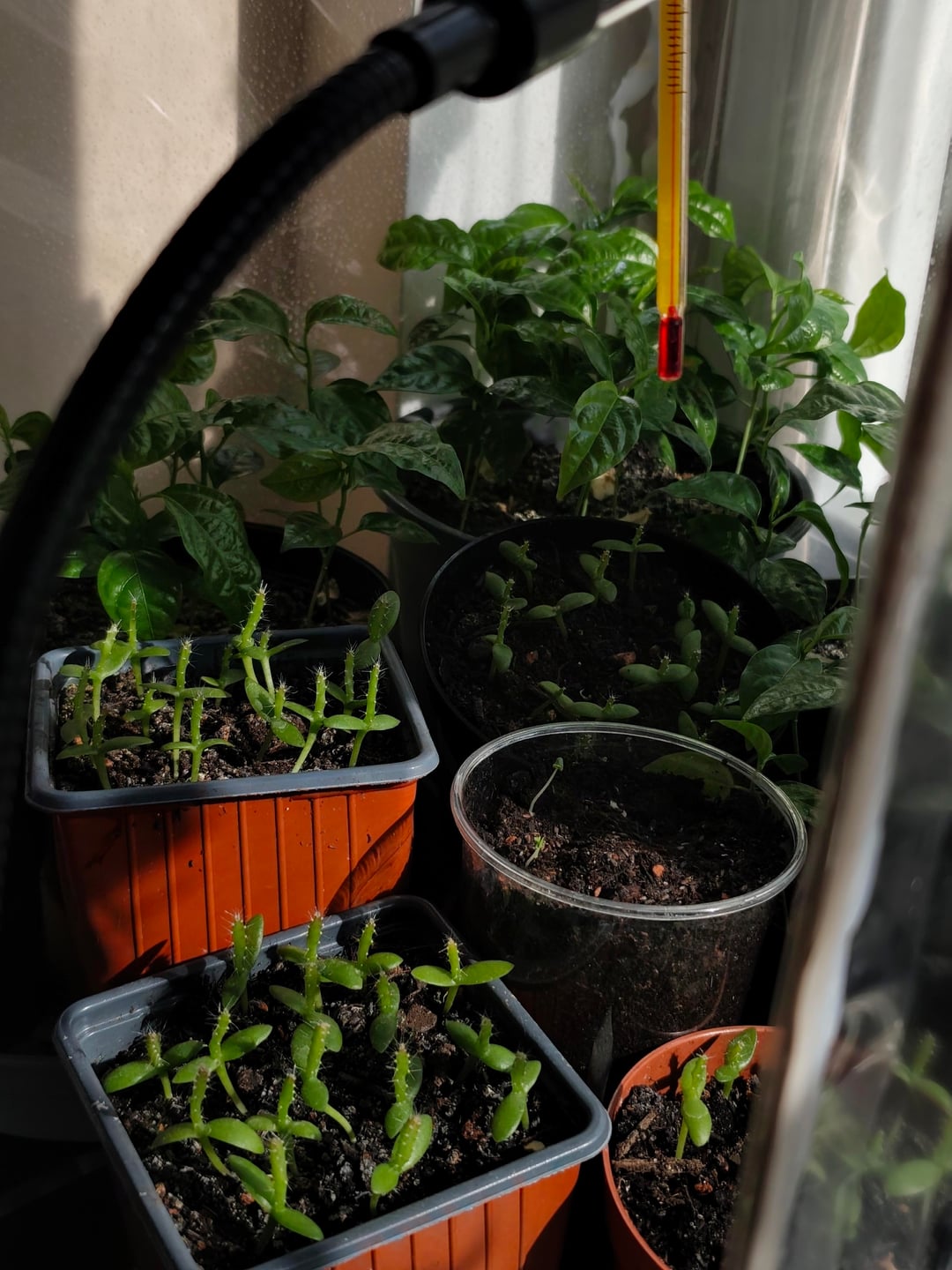 こちらが私の赤ちゃん達です✨ パッションフルーツ、ピタヤ、ラベンダー、スイバ、チャイブ、タイム、アスター、ポピー、アサガオ(2種)、ワスレナグサ ローズマリー、ラビッジ、カルパティア桔梗、レモンバームはまだ発芽していません 1週間半前に種を蒔きました ピタヤとパッションフルーツ以外は11月から来ています